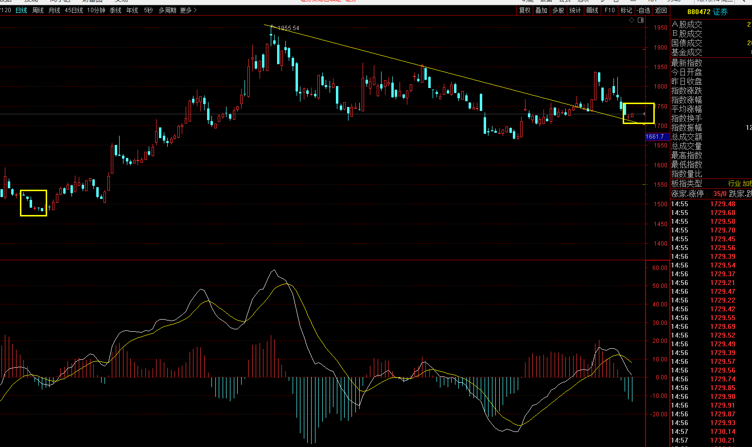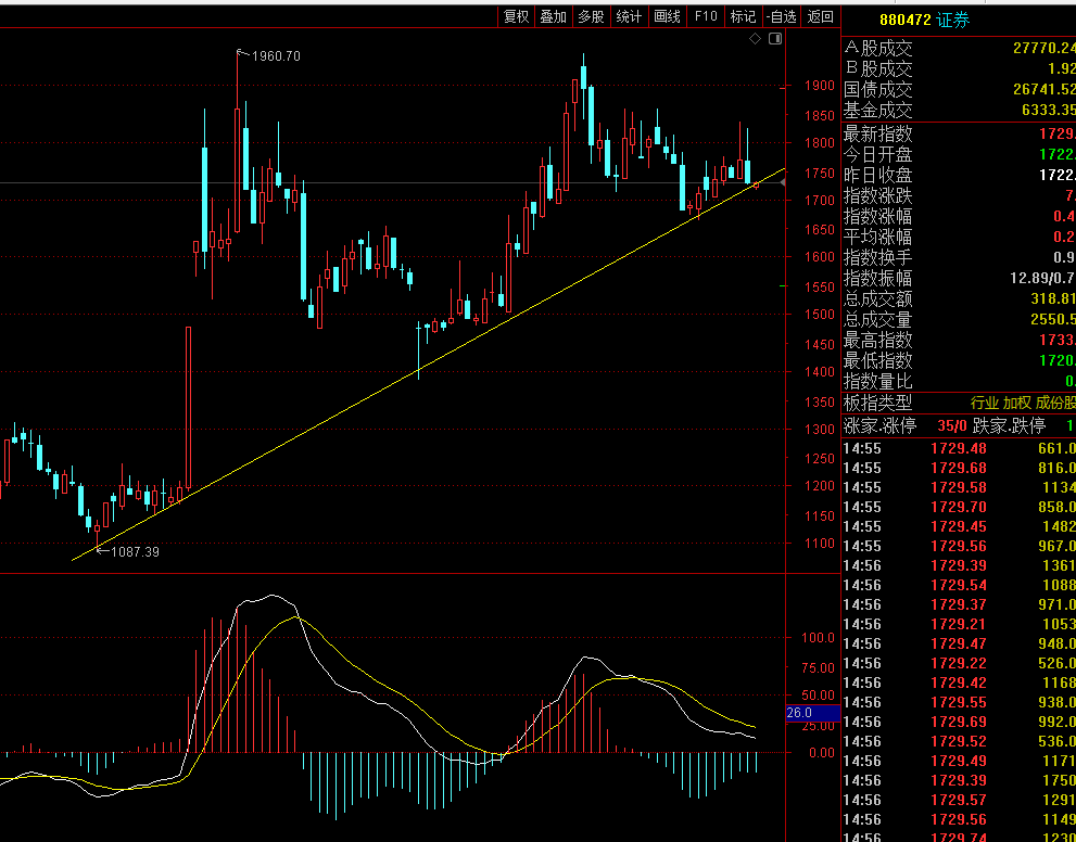 在日K线面券商指数也回调基本上是到位了,它到了下降趋势线的支撑位,周线里面是上升趋势线的支撑位,在日K线里面我们也讲了券商指数类似于5月14号到5月28号那个位置,