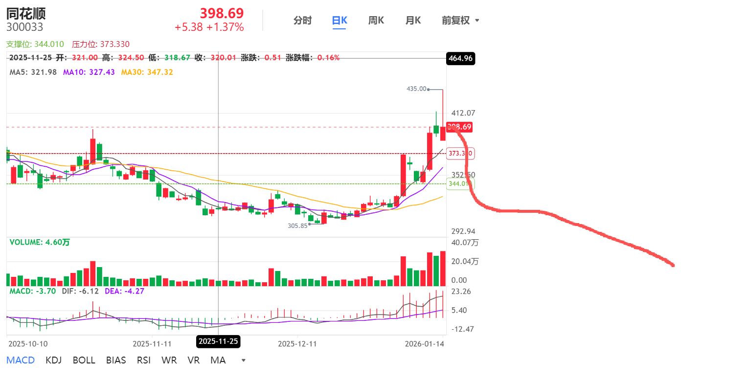 再看看同花顺今天的走势,放了天量却收了个长长的上影线。在技术派眼里,这叫“墓碑线”,意思就是这波反弹彻底到头了。