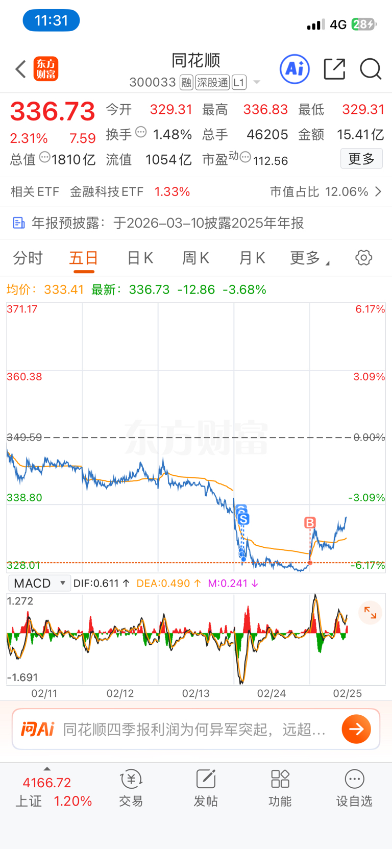 $同花顺(SZ300033)$ 昨天330.4块亏22块割掉了,想了一晚上还是决定买回来,今天329.4买回来的,6600股重新跟你干