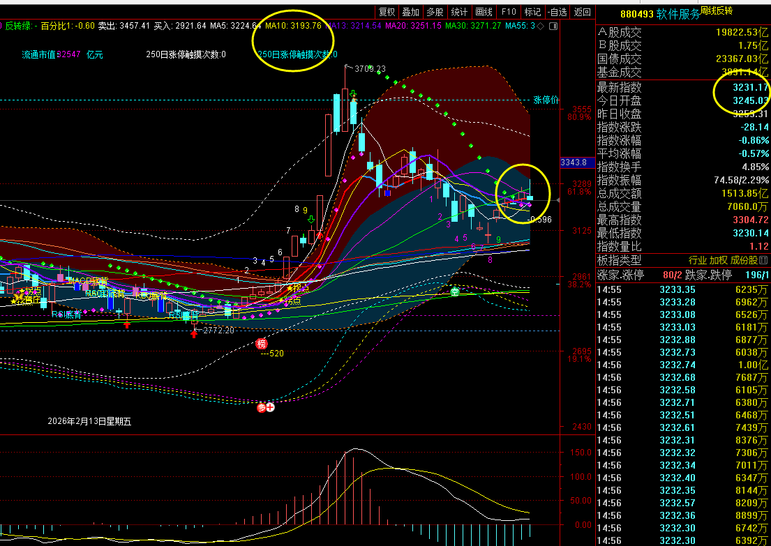 总体上来指数依然是看震荡向上,依然还是看多,有色金属方向不会再次大跌短期也不会大涨,房地产白酒是看多的,软件服务指数在多条中长期的趋势线的支撑位有强烈的支撑,目前软件和光伏设备相比,软件的性价比更高一点,固态电池锂电池这些电池的方向以及电气设备依然是看震荡向上的走势,日线反转点的还有商业航天航空航天。券商软件相关的个股全部都是日线反转位置,券商指数星期二可能会拉起来,影视院线节后依然会分化,AI应用方向依然是我们关注的重点。$广联达(SZ002410)$$汉得信息(SZ300170)$$用友网络(SH600588)$