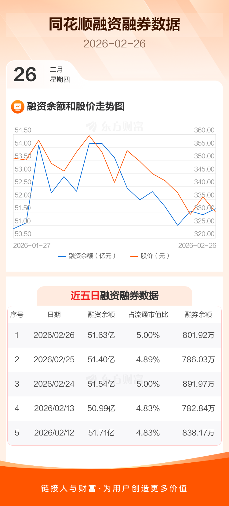 交易所最新数据显示,同花顺于2026年2月26日获融资买入2.64亿元,融资偿还2.41亿元,当日融资净买入2335.94万元。目前,该股融资余额51.63亿,占流通市值比例为5.00%。