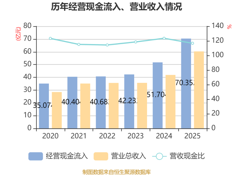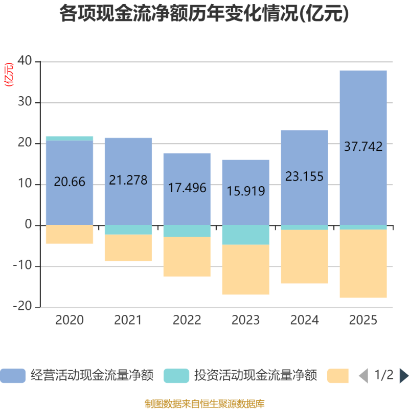 截至2025年,公司经营活动现金流净额为37.74亿元,同比增长63%;筹资活动现金流净额-16.67亿元,同比减少3.56亿元;投资活动现金流净额-1.13亿元,上年同期为-1.19亿元。