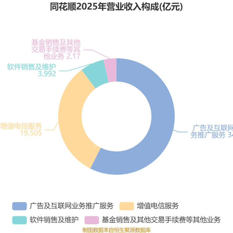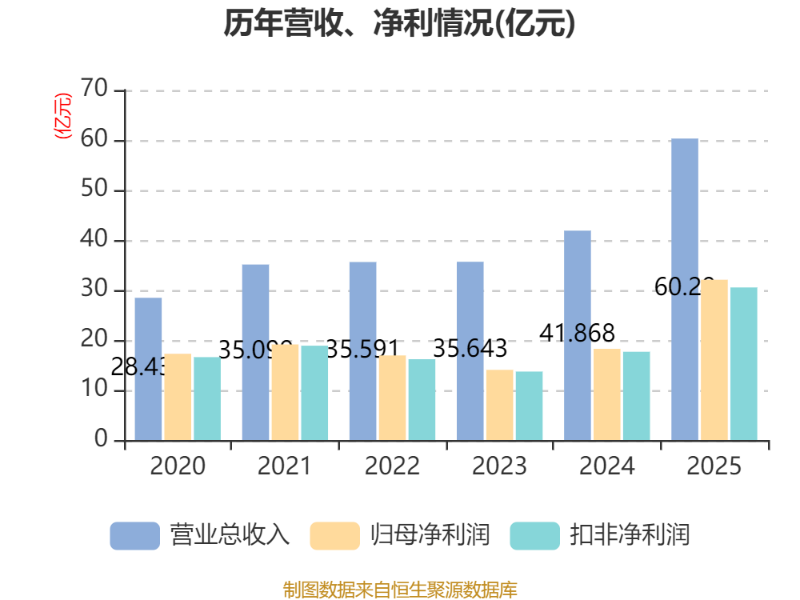 中证智能财讯同花顺(300033)3月10日披露2025年年度报告。2025年,公司实现营业总收入60.29亿元,同比增长44.00%;归母净利润32.05亿元,同比增长75.79%;扣非净利润30.51亿元,同比增长72.87%;经营活动产生的现金流量净额为37.74亿元,同比增长63.00%;报告期内,同花顺基本每股收益为5.96元,加权平均净资产收益率为38.54%。公司2025年度分配预案为:拟向全体股东每10股转4股,派现51元(含税)。