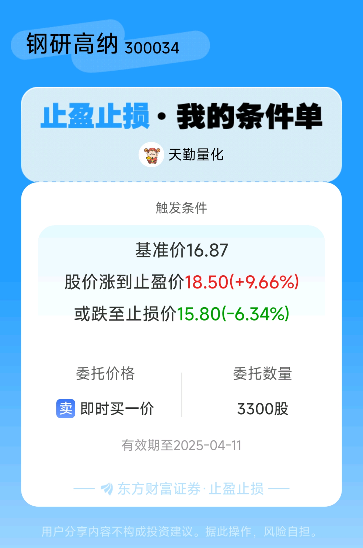 #条件单交流# #止盈止损晒单# 一位股神设置了一个止盈止损条件单,接下来就是见证奇迹的时刻~$钢研高纳(SZ300034)$