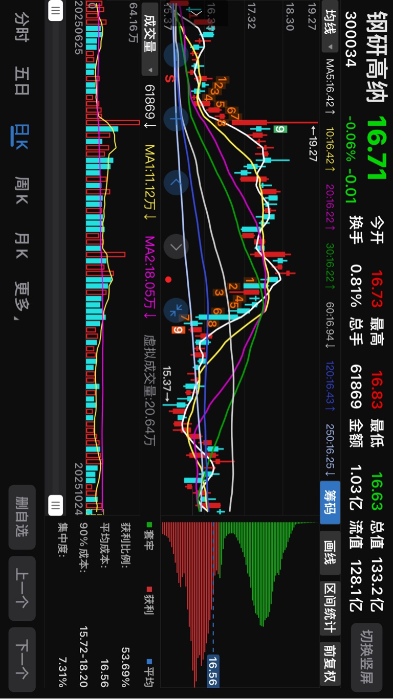 $钢研高纳(SZ300034)$ 从筹码峰看,应该走双峰填谷,这样主力上下通吃,所以股价可能会在这两个峰之间徘徊震荡一段时间,一旦吸筹成功就可看高一线了!昨天kd在50轴附近金叉,短期过前高应无悬念,但想要大涨则应该双峰填谷成功后的事情了,有票的需要耐心的等待。以上纯属个人观点仅供朋友们参考娱乐,不作为投资依据!