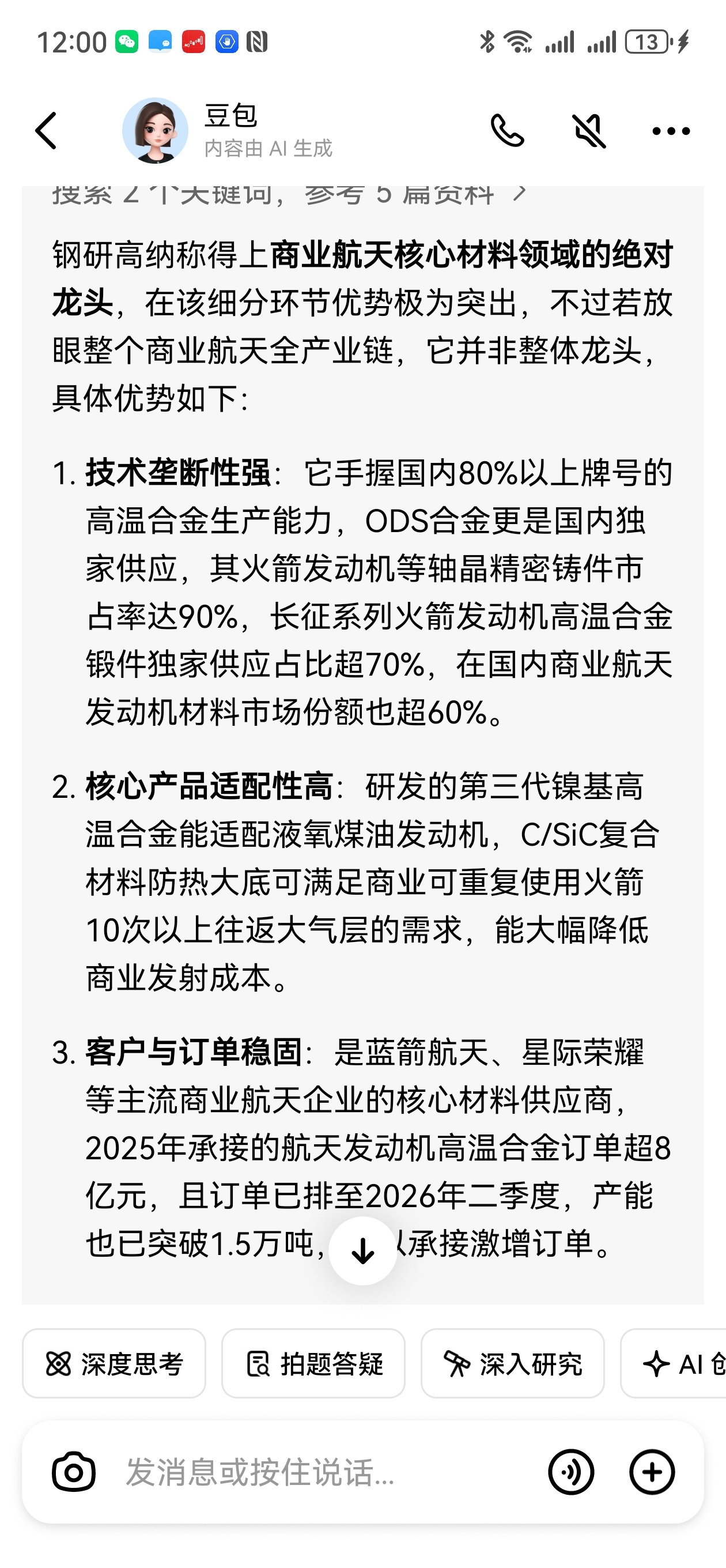 $钢研高纳(SZ300034)$ 钢研高纳是商业航天核心材料领域的绝对龙头