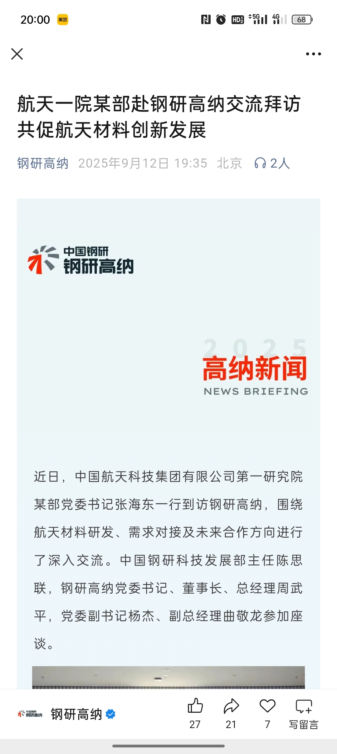 $钢研高纳(SZ300034)$ 对对对,航天一院是因为你的饭好吃所以才去拜访的