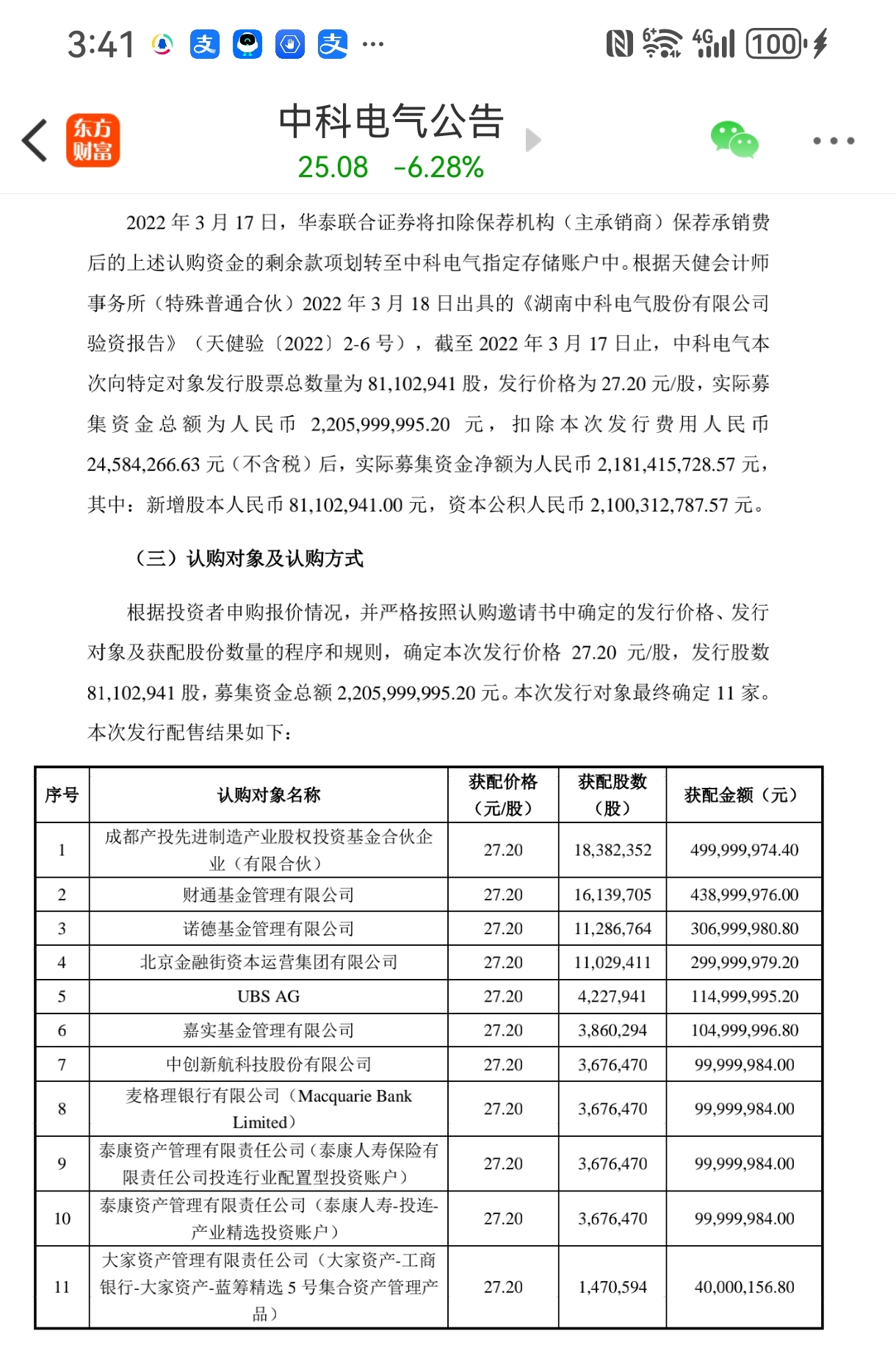 2022年,成都城投27.20元参与了中科电气的定向增发。我们这些股东太幸福了。