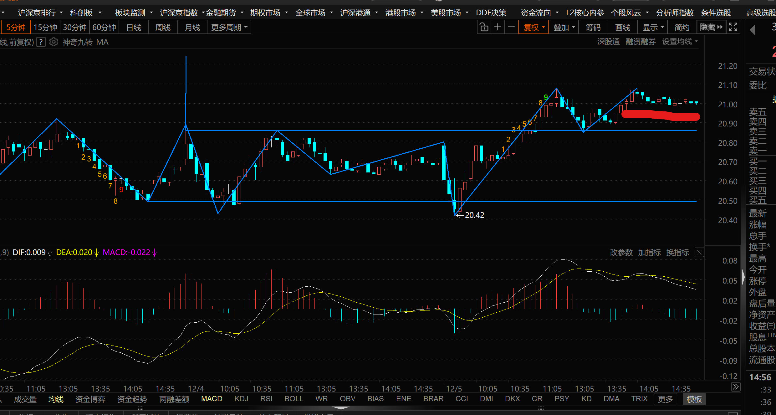 从5分钟图上来看 围绕着 20.8-20.4来回震荡 这个走势中枢是具有引力的 向上突破会被拉回 向下跌破也是。