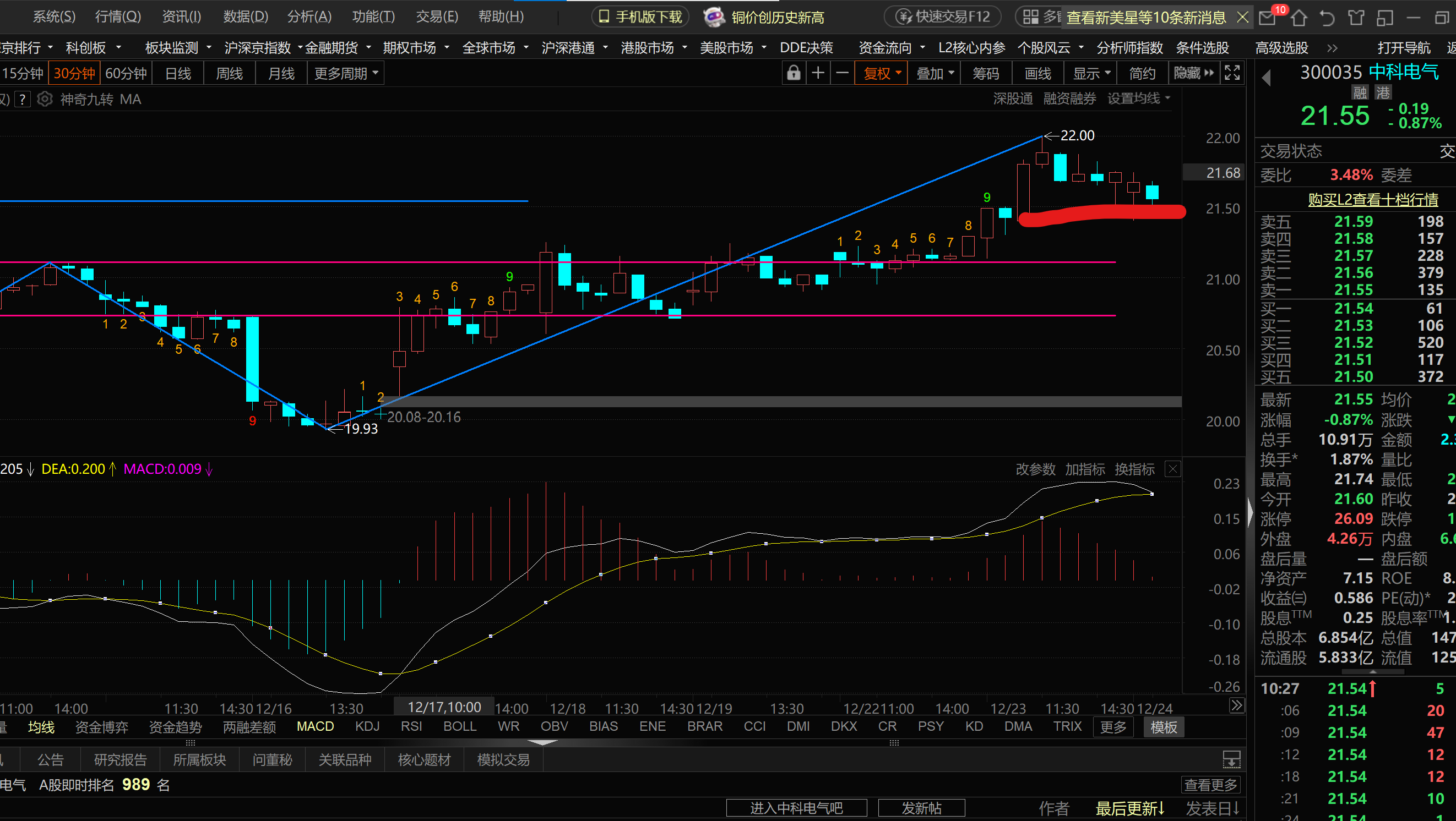 22拉升后 遇到压力 回落 看 是要回踩 走势中枢上轨道还是 走势中枢内 这很关键
