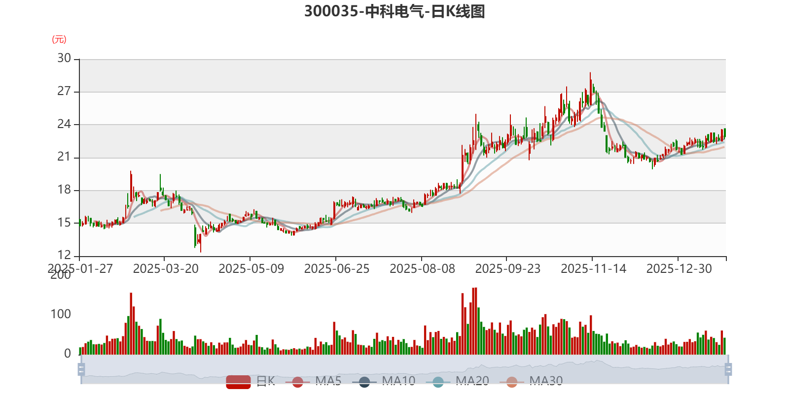 中证智能财讯中科电气(300035)1月26日晚间披露2025年度业绩预告,预计2025年归母净利润4.55亿元至5.15亿元,同比增长50%-70%;扣非净利润预计3.8亿元至4.83亿元,同比增长10%-40%。以1月26日收盘价计算,中科电气目前市盈率(TTM)约为30.5倍-34.56倍,市净率(LF)约3.2倍,市销率(TTM)约2.07倍。