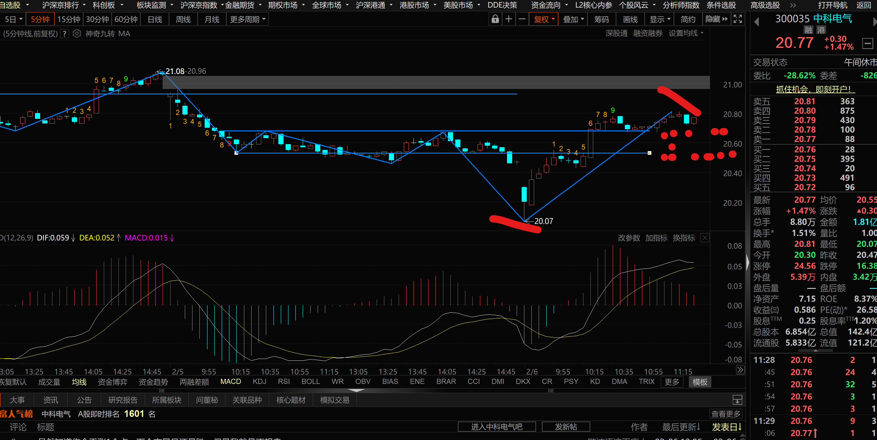 从5分钟看 20.07-20.81这里从走势中枢下沿 到 上沿突破 这个位置 还是有承接的