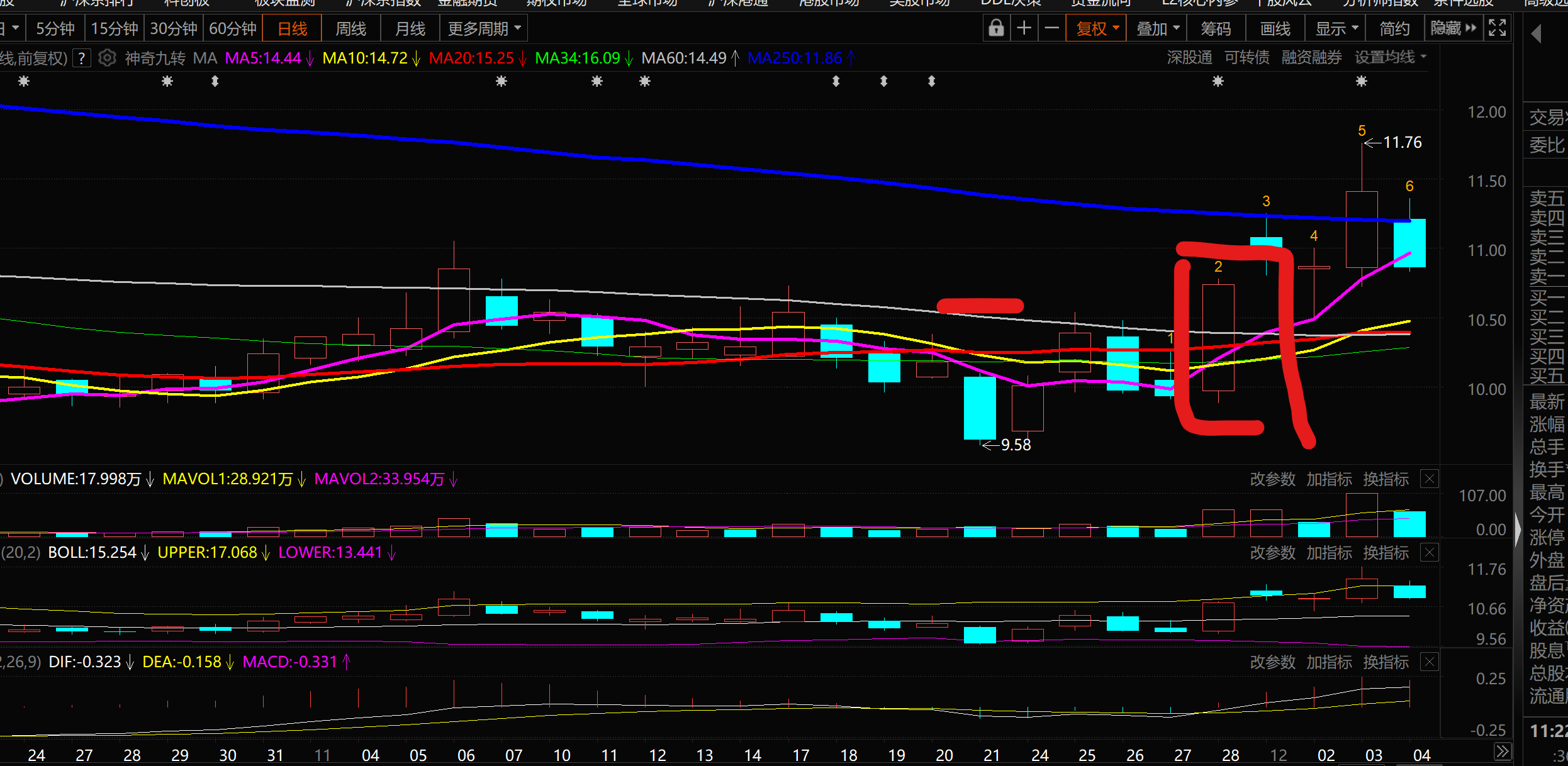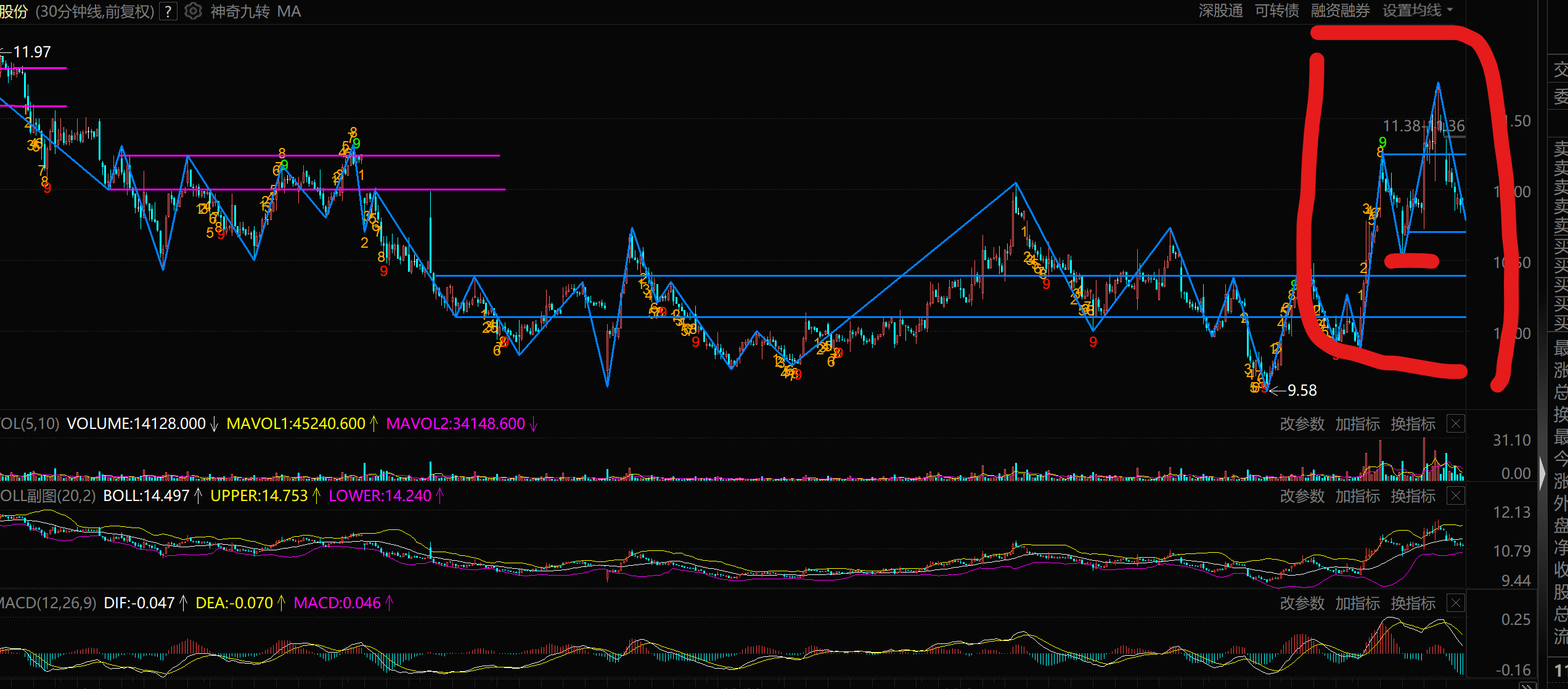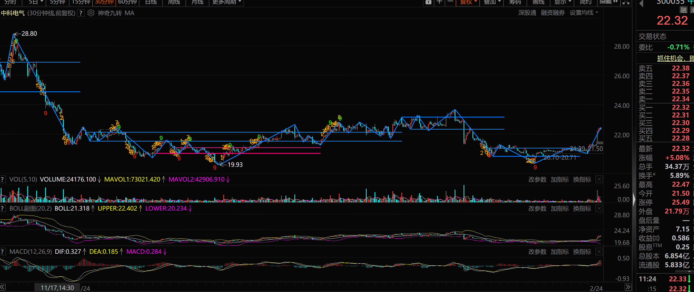 那只票当天倍量突破60日均线的走势他的30分钟盘整后突破没回走势中枢内部的当时情