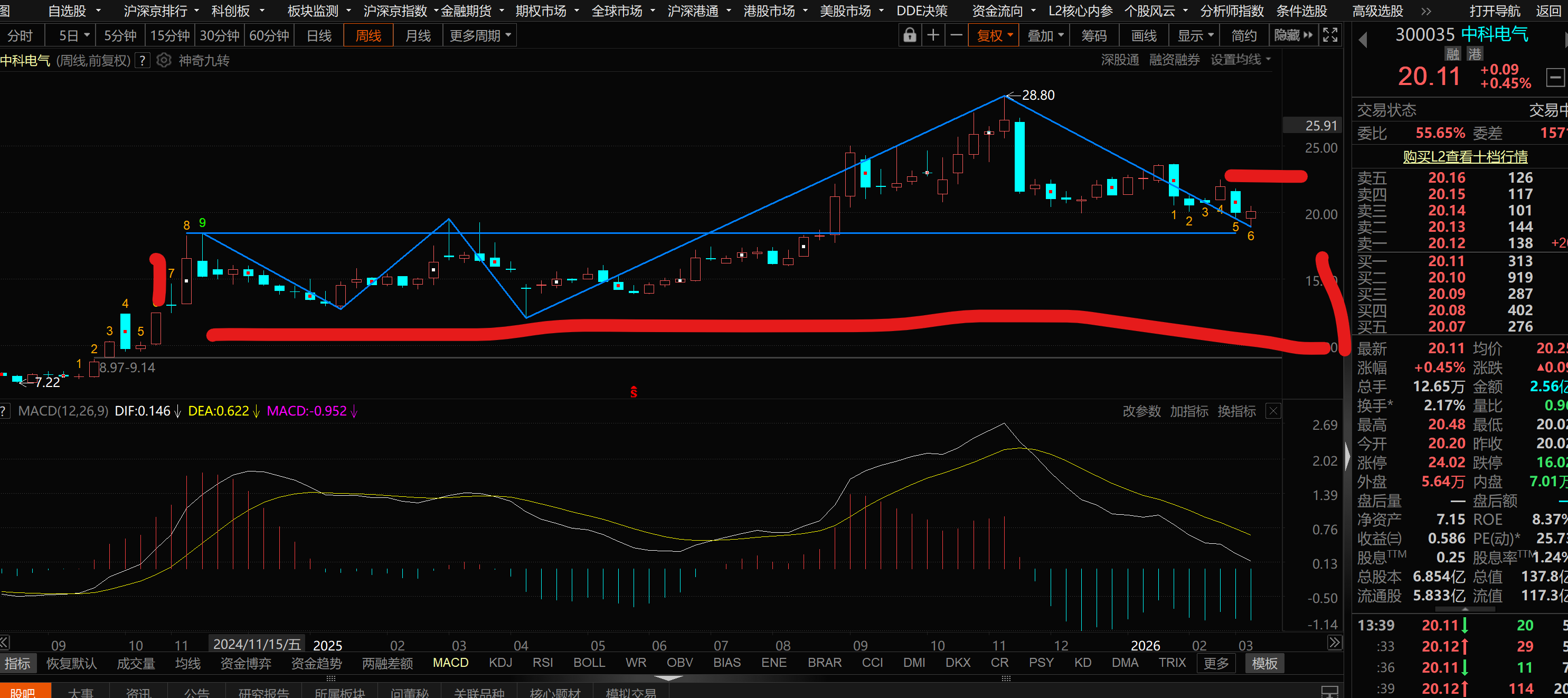 周线回踩到 前面走势中枢上沿上方 这里出底分型 还是三买 以周来算 先定方向