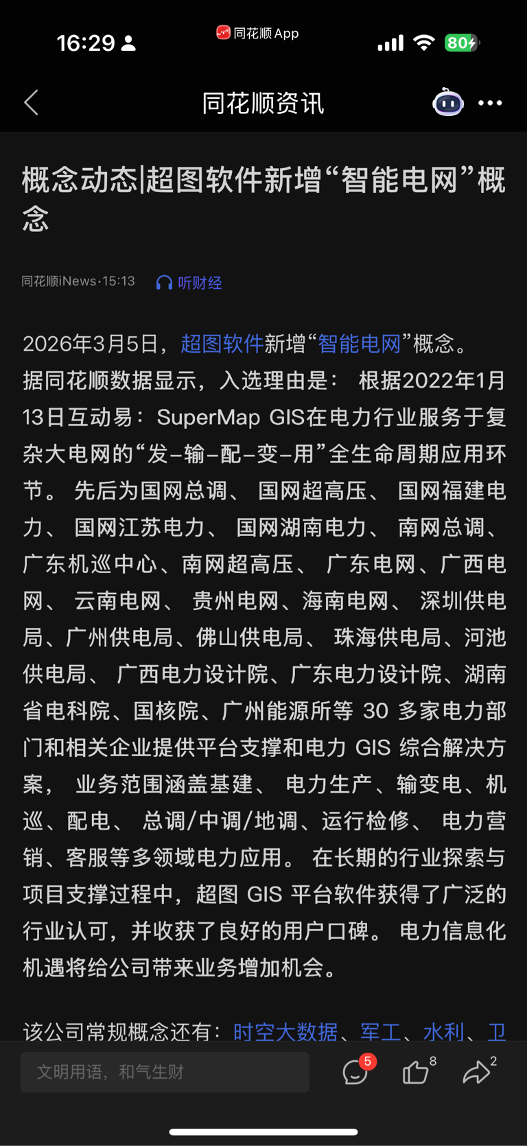 $超图软件(SZ300036)$ 超图在同花顺那边又蹭上了,明天电网调整