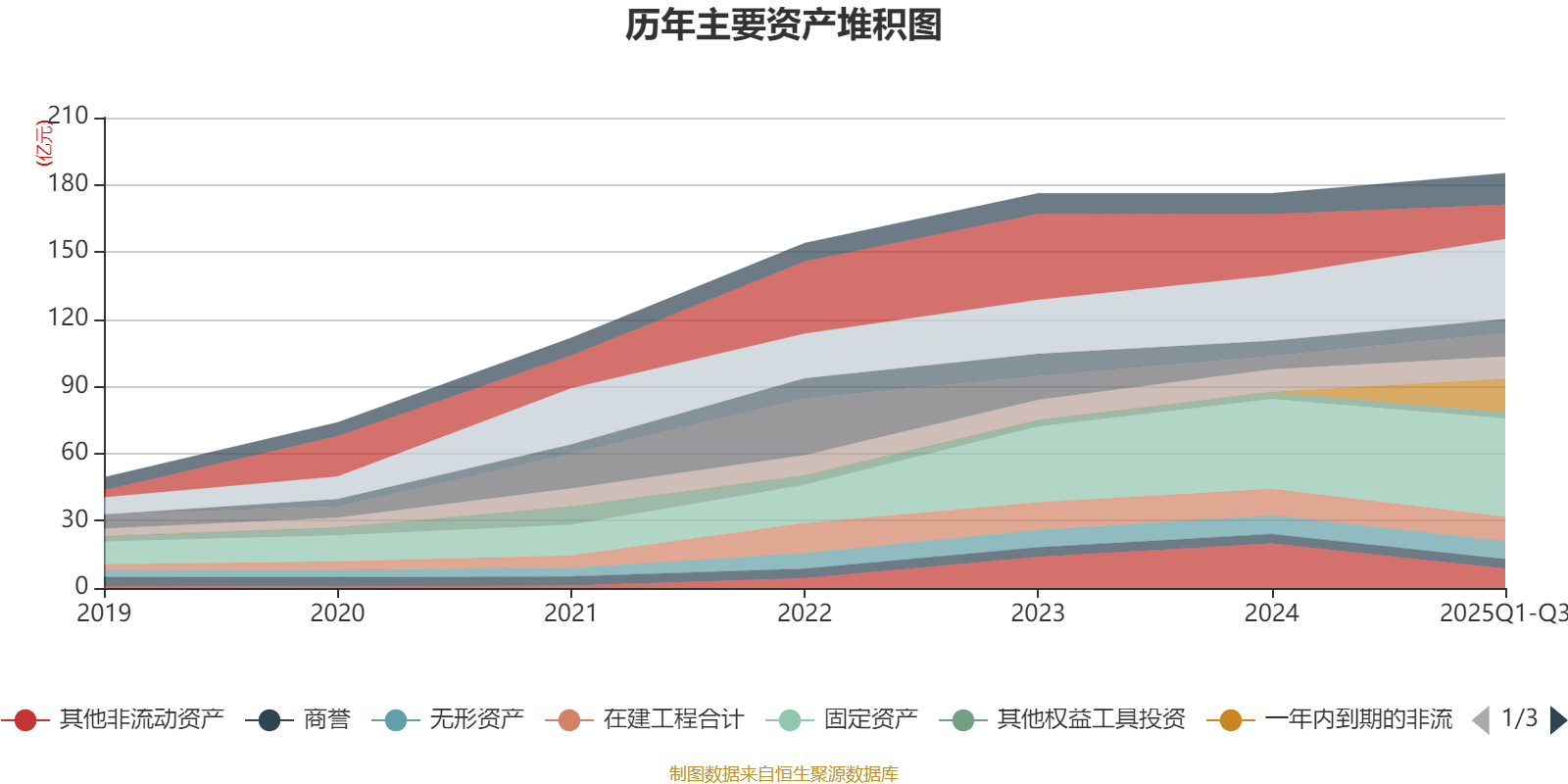 资产重大变化方面,截至2025年三季度末,公司一年内到期的非流动资产较上年末增加14383.58%,占公司总资产比重上升8.07个百分点;货币资金较上年末减少43.89%,占公司总资产比重下降7.26个百分点;其他非流动资产较上年末减少56.39%,占公司总资产比重下降6.61个百分点;应收票据及应收账款较上年末增加23%,占公司总资产比重上升2.81个百分点。