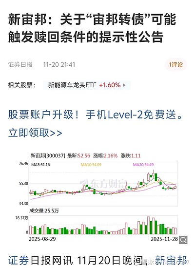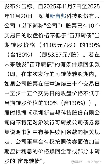 $新宙邦(SZ300037)$刚才在东方财富网股吧里面看到一些股民说 公司为了可转债强赎,拼命打压股价,这是什么智商也来炒股唉,实在受不了了,我丢下事情解读一下吧:新宙邦公司有可转债规模19.7亿元,转股价41.5元,每股全部转股规模4799万股。目前可转债尚未转股规模18.04亿元,占可转债规模的93.8%,触发条件是30天内15个交易日收盘价不低于转股价的130%及53.37元每股。在解读之前我先说一下强赎触发价是什么意思?遇到强制赎回该如何操作?强赎触发价是个啥?简单说就是"强制赎回的红线"。比如你买的可转债,发行时条款里会写清楚:"如果连续30个交易日中有15天股价超过转股价的130%,公司有权按面值+利息强制赎回"。这个130%就是强赎触发价。为什么会有这种设定?上市公司可不是做慈善的。当股价涨太多,他们巴不得让你把债券转成股票(这样就不用还钱了)。比如某转债转股价10元,股价涨到13元并维持一段时间,公司就会启动强赎——要么你赶紧转股赚30%,要么被按100块出头的价格强制赎回,都知道选前者。目前新宙邦股票在2025年11月7号至2025年11月28日连续16个交易日已经有10个交易日股价超过 53.37元每股,也就是说在接下来的14个交易日,他只要有5个交易日股票价格不低于53.37元每股就可实行强赎,假如你是债券的持有者,你会被按100块加点利息被公司强制赎回而亏掉约30%(目前可转债价格在138块钱每股),你肯定会去转股赚差价,这正是公司发行可转债的用意所看到的,新宙邦公司就不用拿出19亿的真金白银去赎回可转债了。你说公司在接下来是会拉高股价还是打压股价?