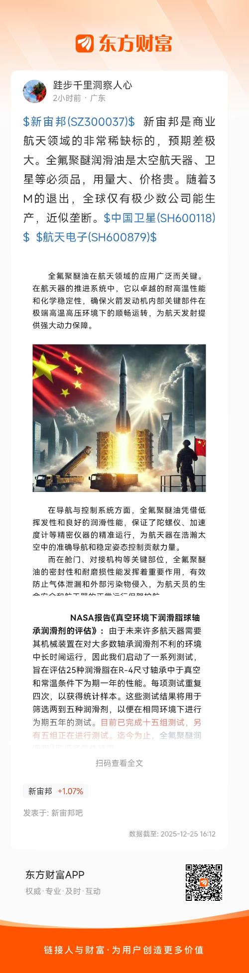 $新宙邦(SZ300037)$ 新宙邦是商业航天领域的非常稀缺标的,预期差极大。全氟聚醚润滑油是太空航天器、卫星等必须品,用量大、价格贵。随着3M的退出,全球仅有极少数公司能生产,近似垄断。$中国卫星(SH600118)$ $航天电子(SH600879)$