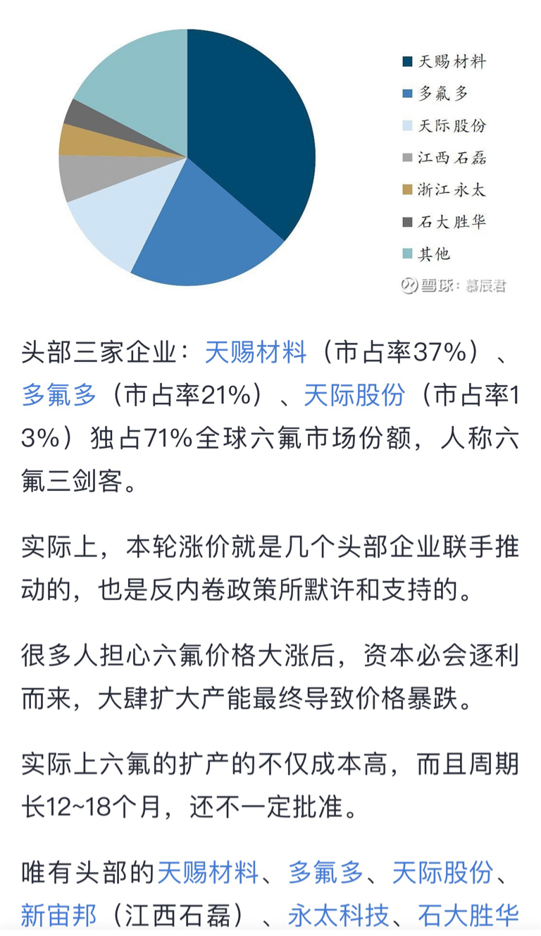 $新宙邦(SZ300037)$ 石磊的六氟产能目前2.4万吨折算差不多8%+全球产能,随着年底技改完成产能达到3.6万吨每年,全球产能市占率应该可以占10%+妥妥的老四