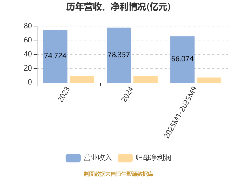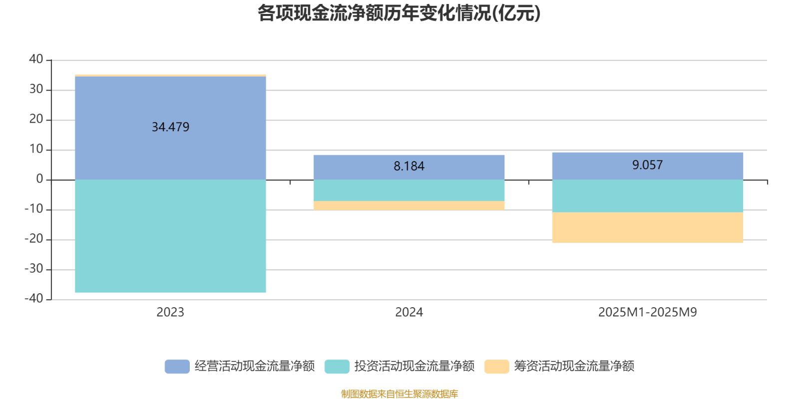 2025年1月至9月,公司经营活动现金流净额为9.06亿元,同比增加10.96亿元;筹资活动现金流净额-10.19亿元,同比减少6.26亿元;投资活动现金流净额-10.97亿元,上年同期为-13.38亿元。