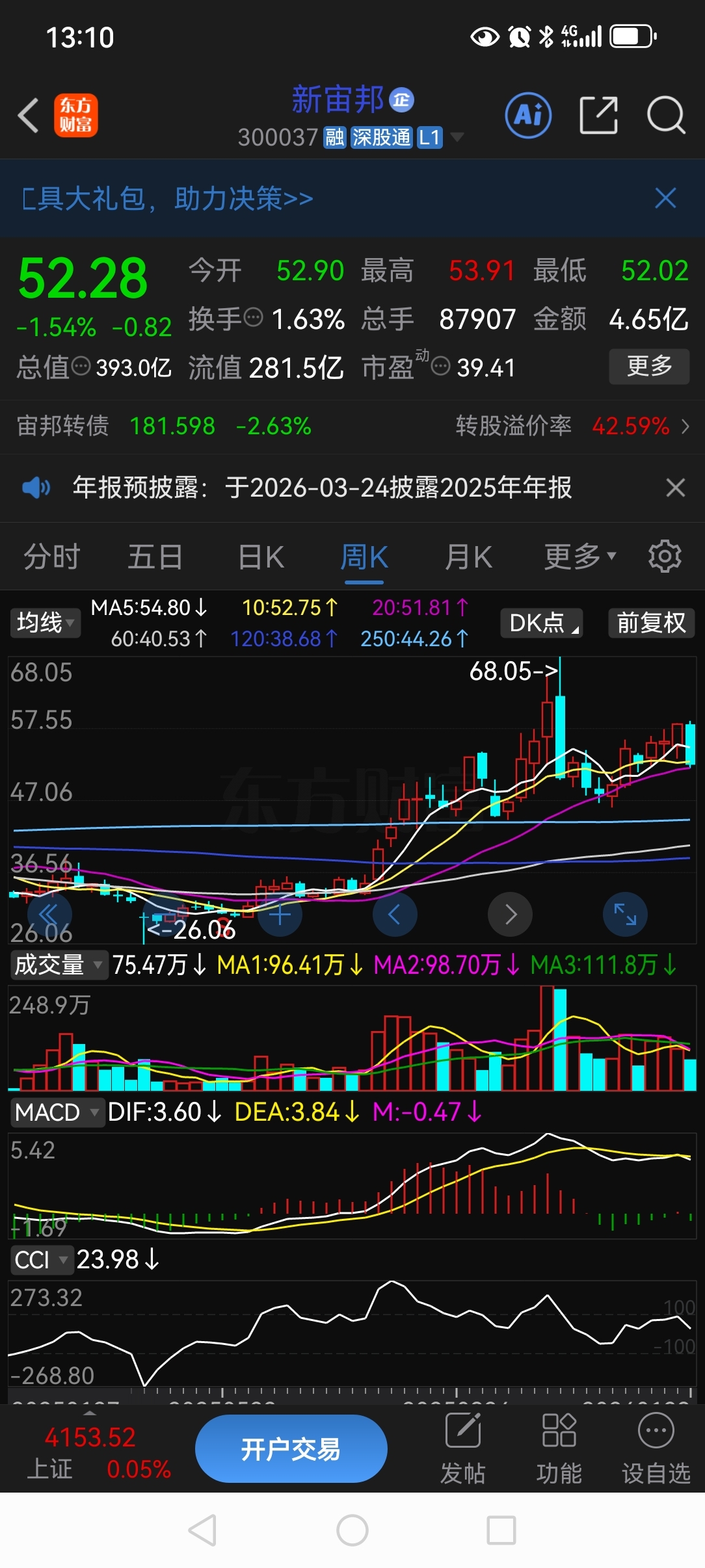 $新宙邦(SZ300037)$ 周线上周刚金叉,这周就死叉了,今天和明天不大阳线,调整目标44