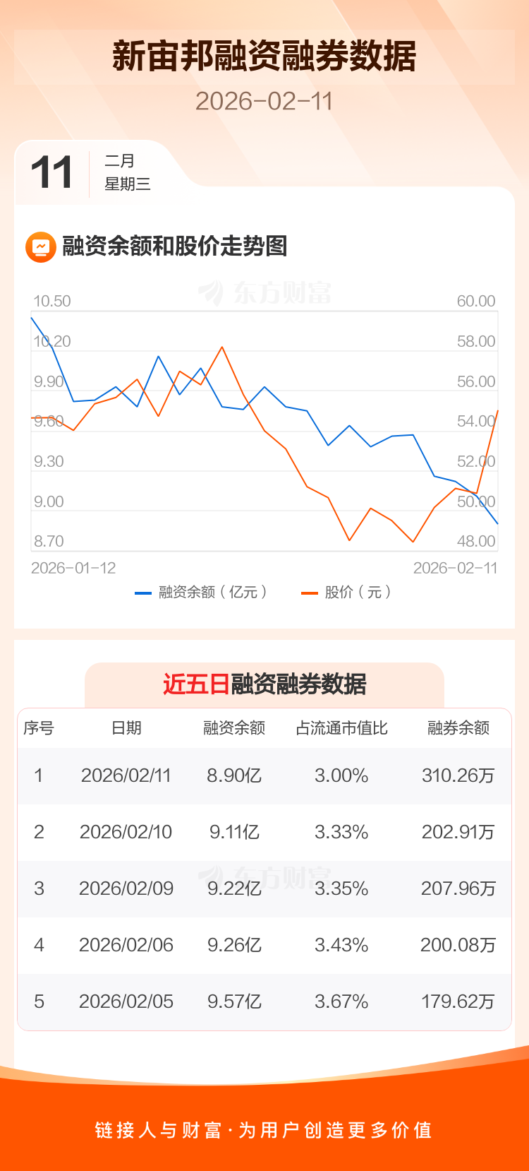 交易所最新数据显示,新宙邦于2026年2月11日获融资买入1.31亿元,融资偿还1.52亿元,当日融资净偿还2144.21万元。目前,该股融资余额8.90亿,占流通市值比例为3.00%。