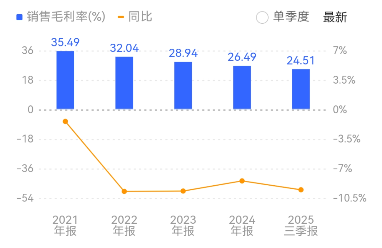 尽管新宙邦的业绩持续增长,但其盈利能力却面临挑战,2021年至2025年前三季度,公司的销售毛利率由35.49%逐步下滑至24.51%。