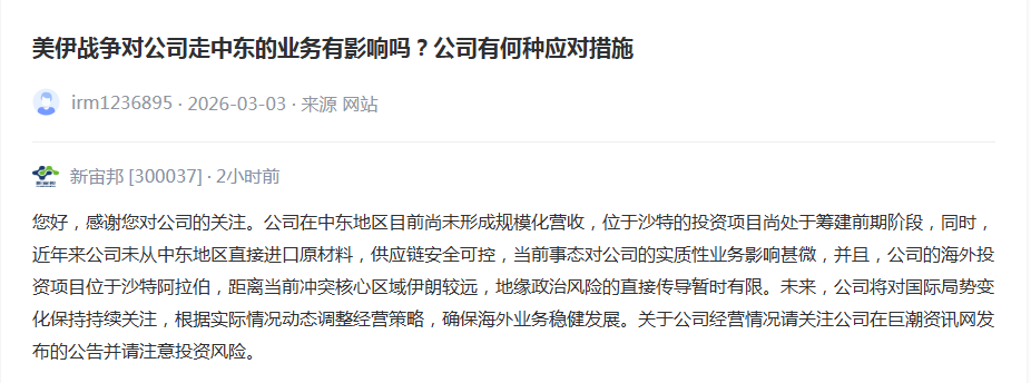 3月9日早间,对于美伊战争对公司走中东的业务影响,新宙邦(300037)在互动平台表示,公司在中东地区目前尚未形成规模化营收,位于沙特的投资项目尚处于筹建前期阶段,同时,近年来公司未从中东地区直接进口原材料,供应链安全可控,当前事态对公司的实质性业务影响甚微。