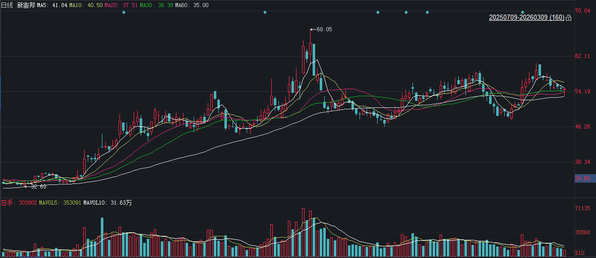 二级市场上,截至3月9日午间收盘,新宙邦下跌0.35%报54.50元/股,总市值约409.73亿元,近一年公司股价累计上涨约58%。