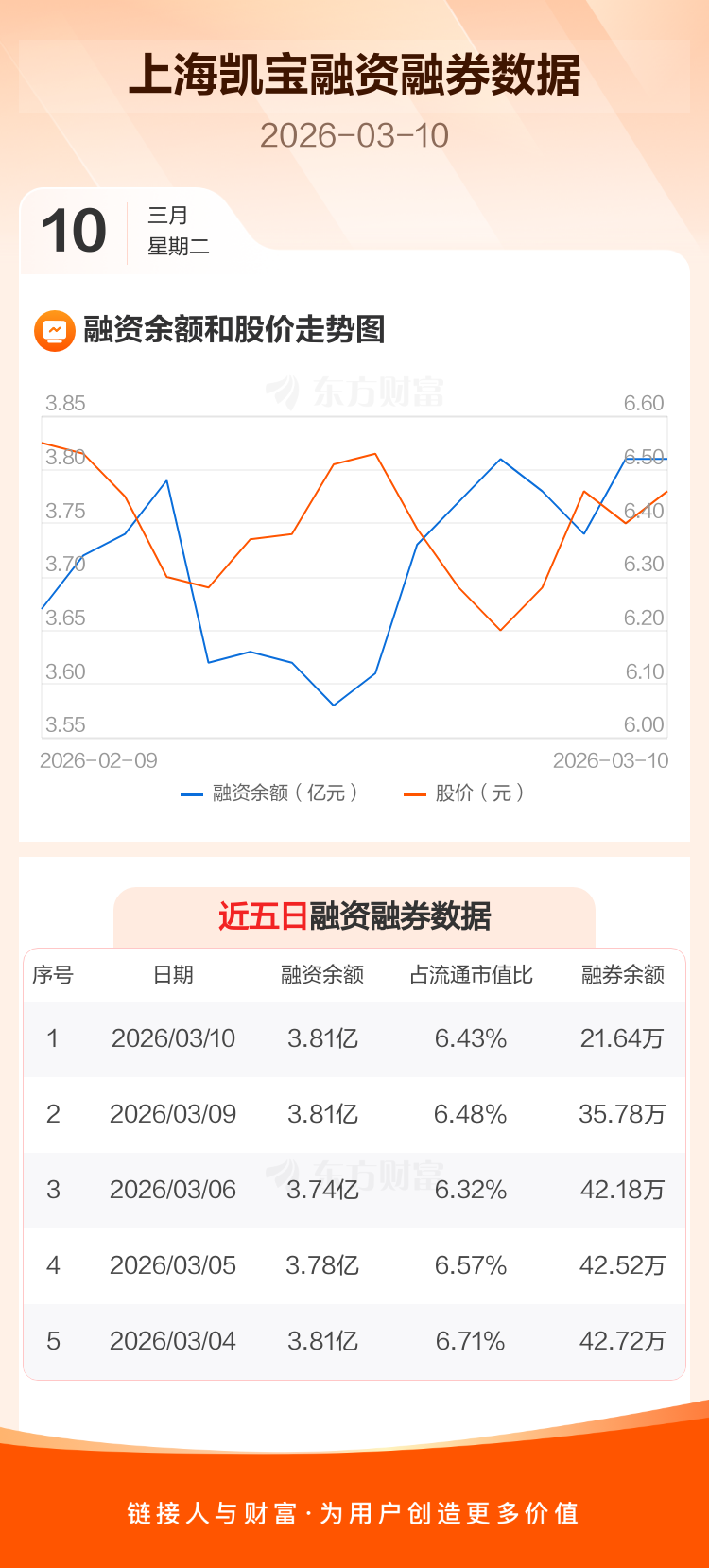 交易所最新数据显示,上海凯宝于2026年3月10日获融资买入2219.08万元,融资偿还2170.40万元,当日融资净买入48.68万元。目前,该股融资余额3.81亿,占流通市值比例为6.43%。