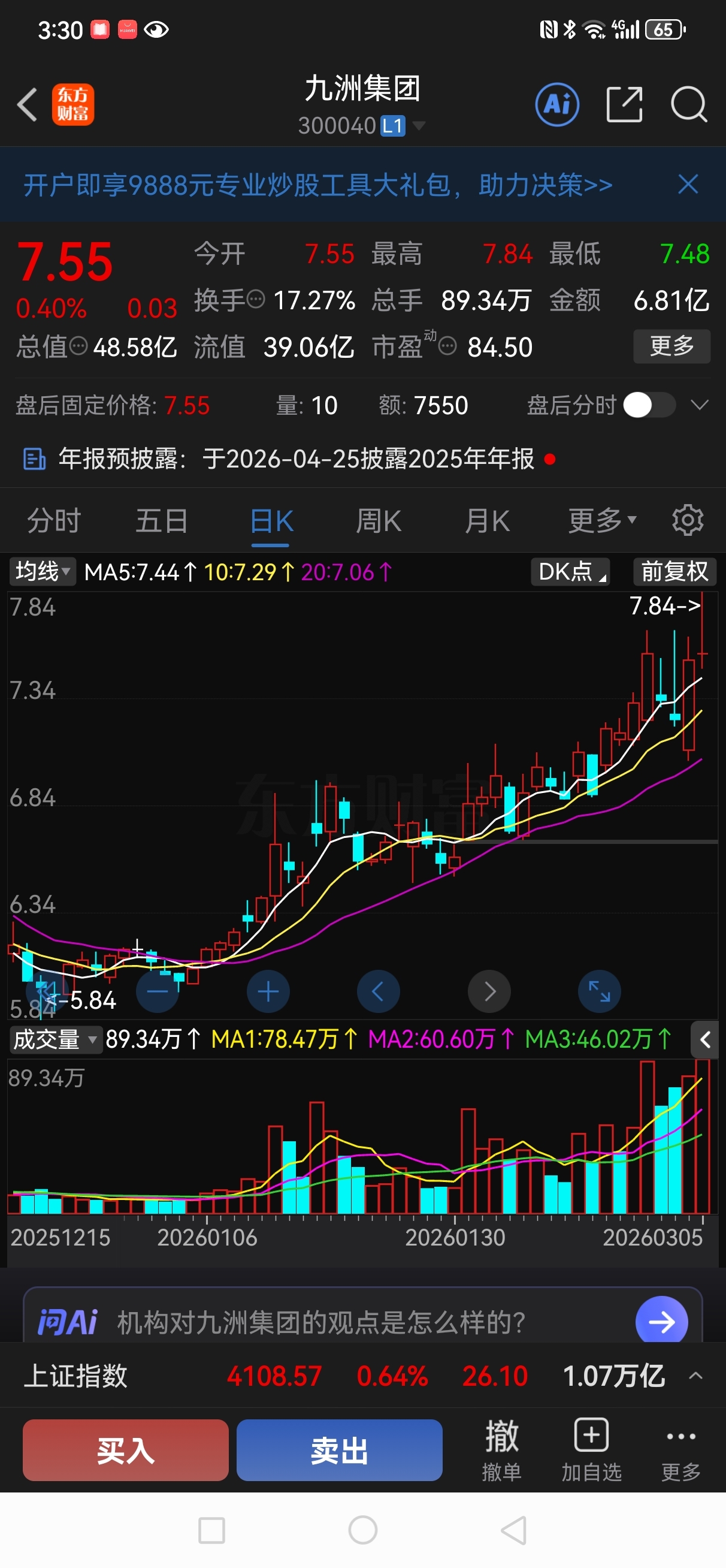 明天10日线7块4,计划进她点,高于7块5先不进,低于7块5随时进驻K线已经起牛
