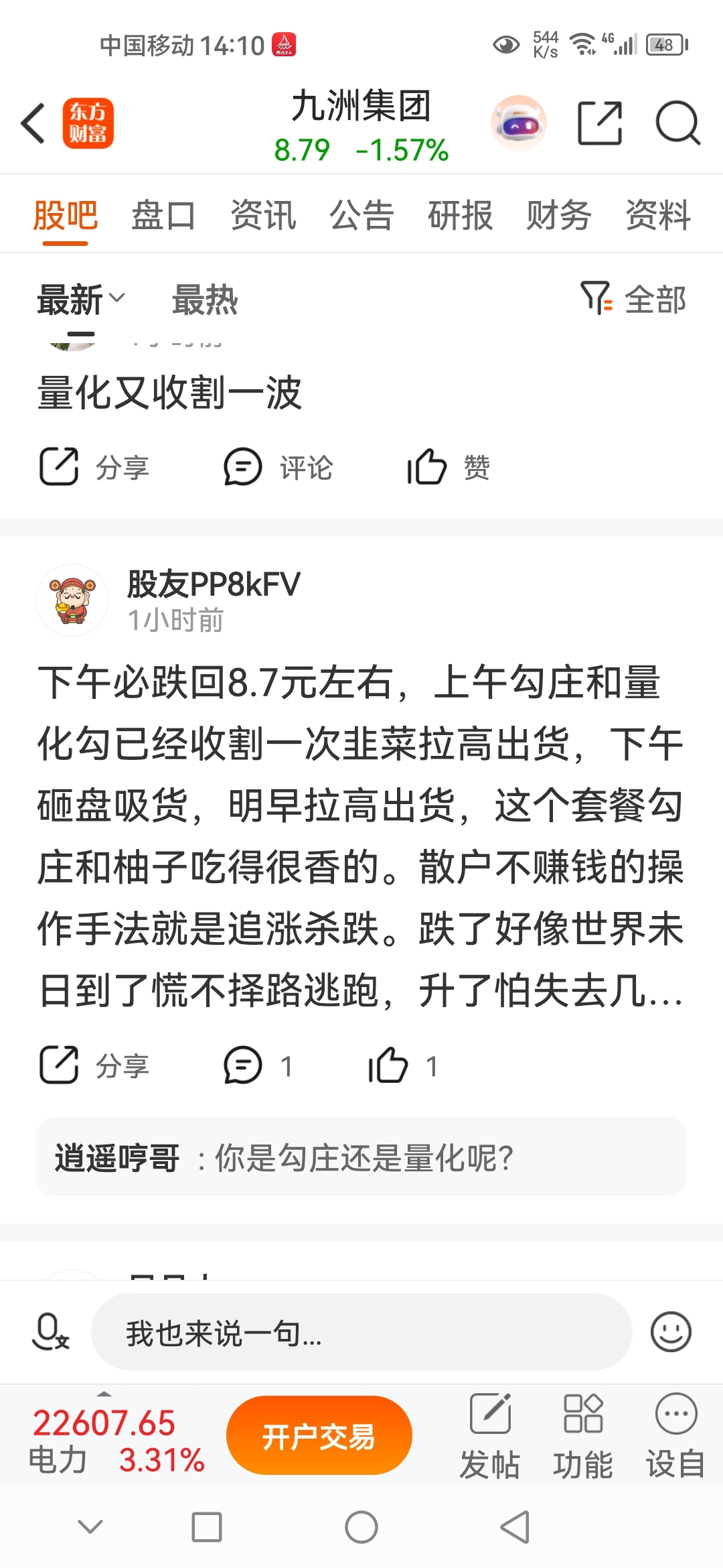 中午12点多发贴:预测九洲下午必跌到8.7元左右,结果下午最低刚好8.7元,是不