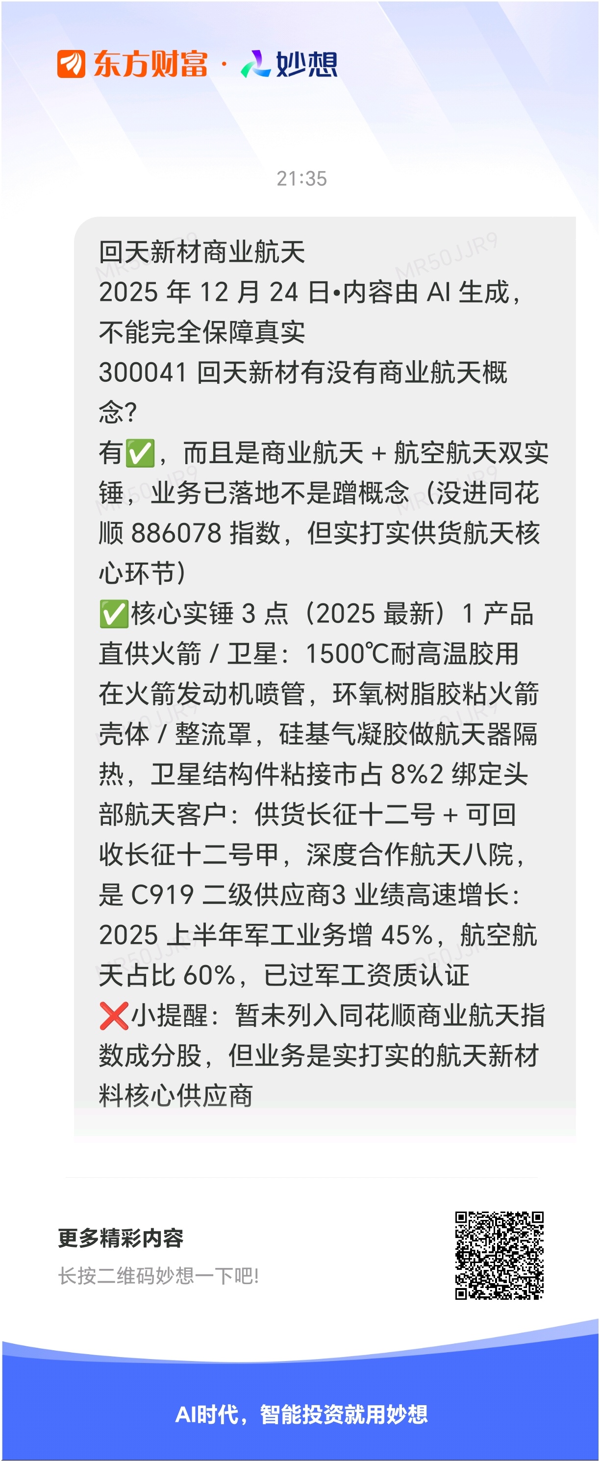 妙想一下:回天新材商业航天2025年12月24日•内容由AI生成,不能完全保障真