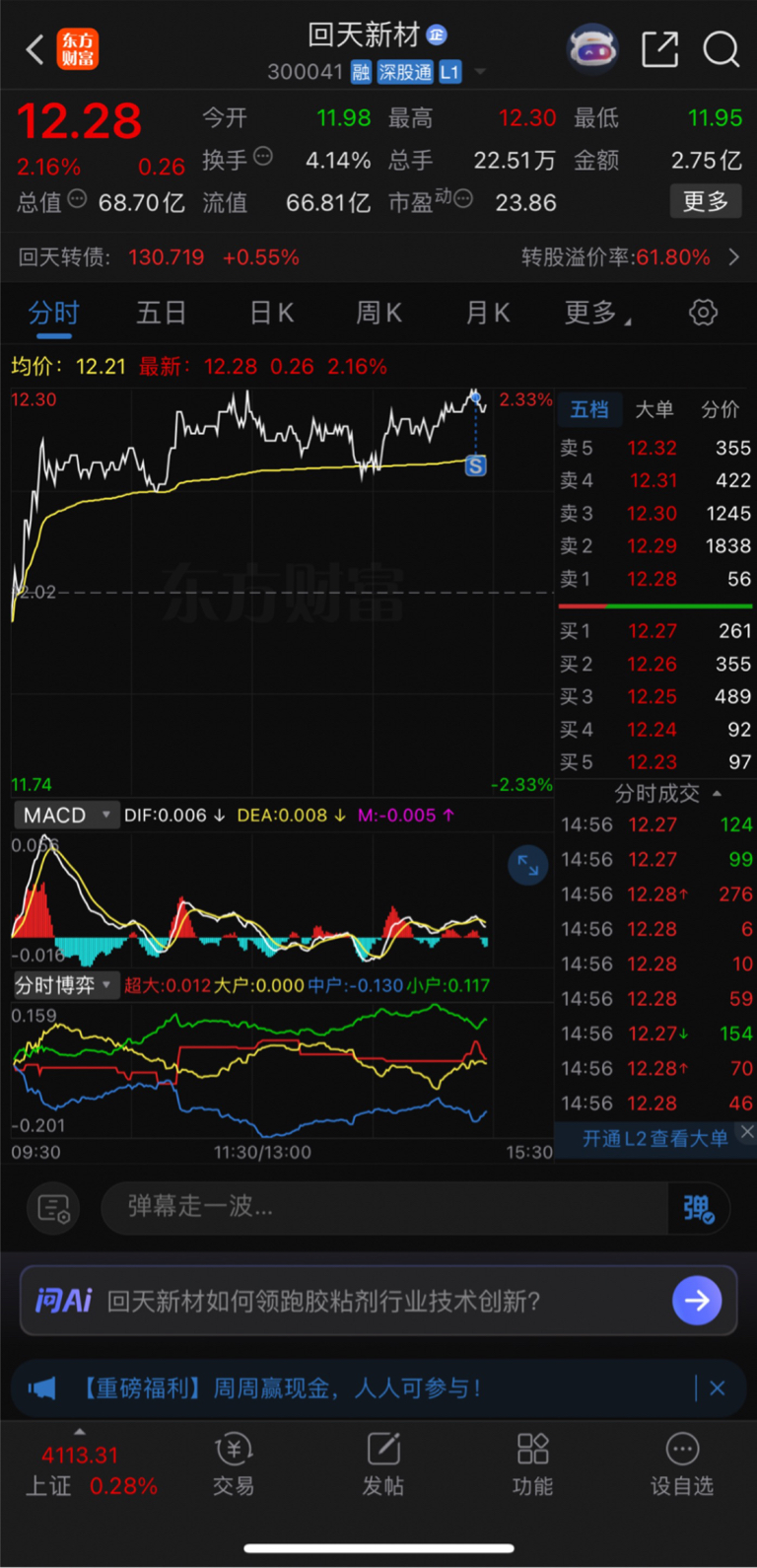 $回天新材(SZ300041)$ 卖了一点。你要是明天敢跌,那我继续加仓。所以为了甩掉我,你明天最好别跌