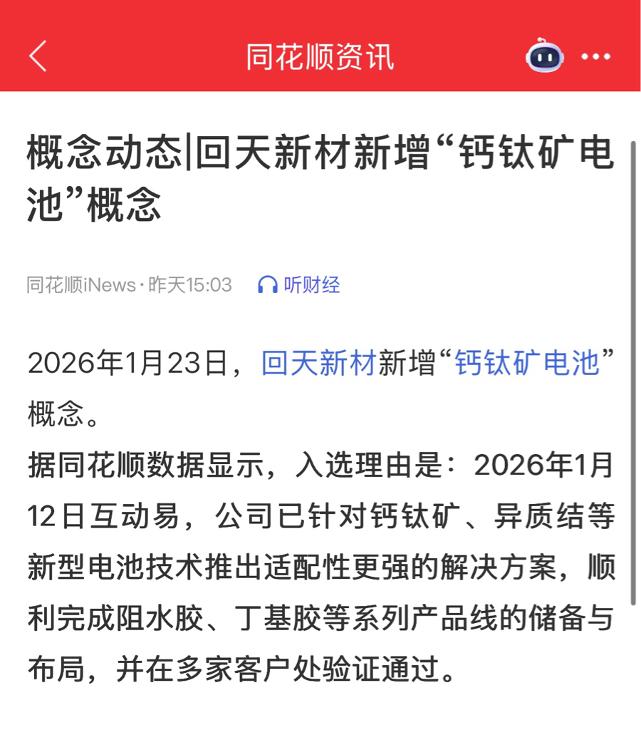 $回天新材(SZ300041)$ 同花顺都增加了钙钛矿电池概念了,这里怎么没有显示新增呢?