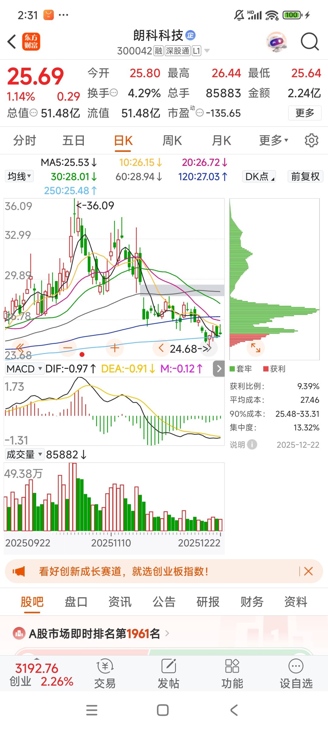 $朗科科技(SZ300042)$ 朗科从36到现在25多,跌了11块,所有低位唱空的,和高位唱多的,一样歹毒,任何散户影响不了一支股的走势,有些东西,不研究股票,在那拼命搞人身攻击,这东西一个字,很箭