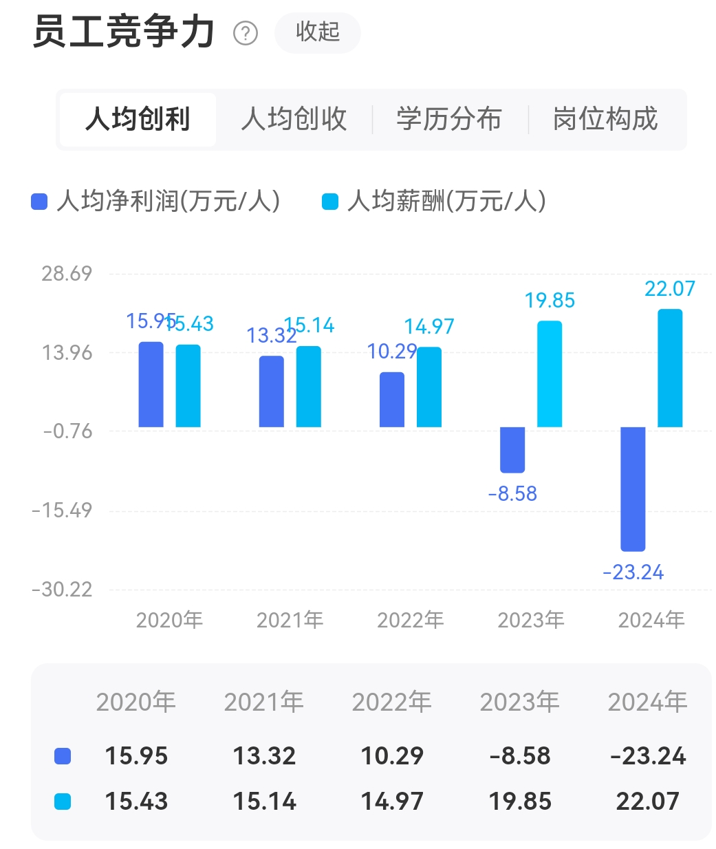 看到了吗?人均创利已经是负的了,但是人均薪酬越来越高,年收入已经达到了22.07