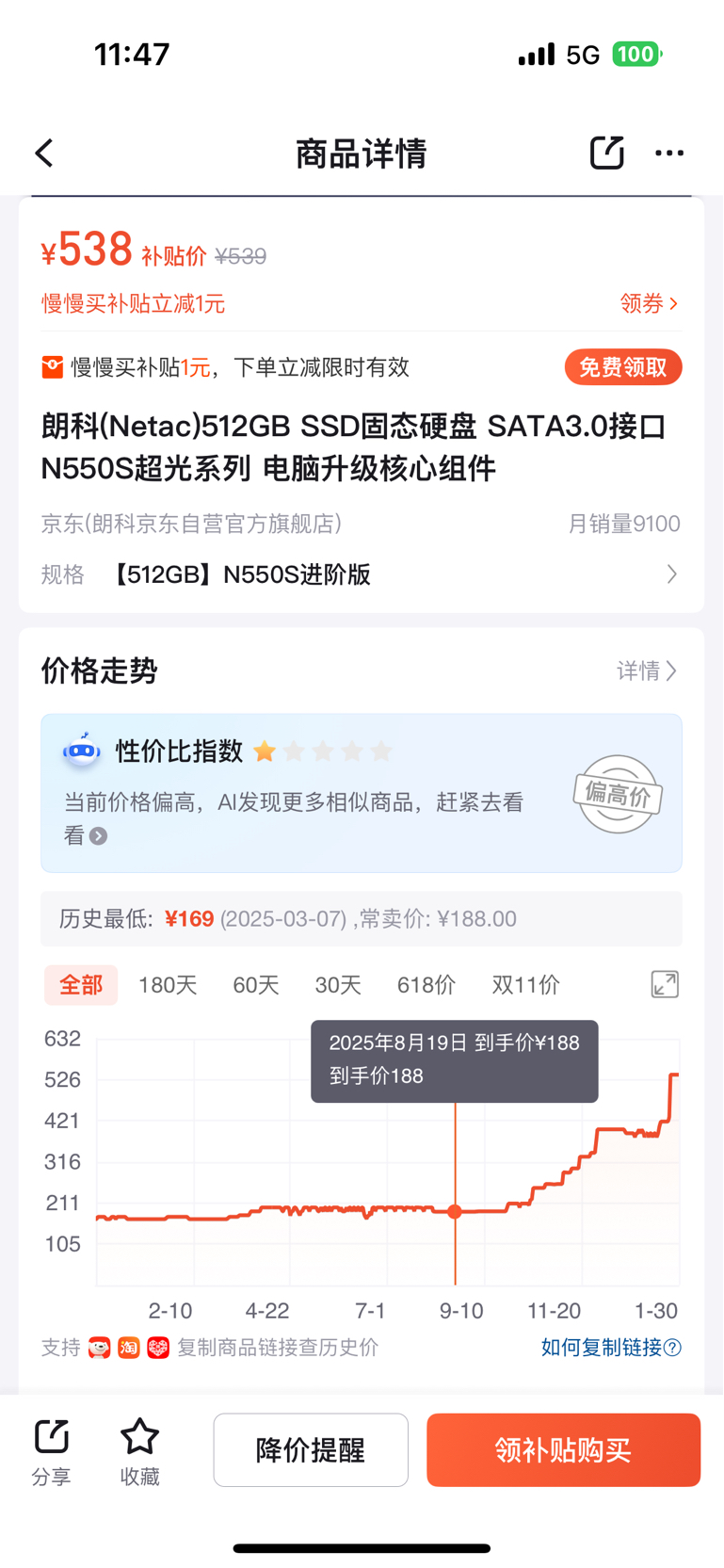 朗科销量最高的硬盘,价格从去年9月底的1881涨到现在的538,涨幅186%,今
