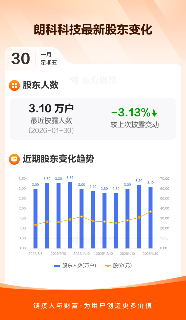 朗科科技最新披露数据显示,截至1月30日公司股东户数为3.10万户,较上期(2026年1月20日)减少1000户,降幅为3.13%。户均持有流通股数量由上期的6261股上升至6463股,户均持股金额由上期的19.49万元增加至23.96万元。