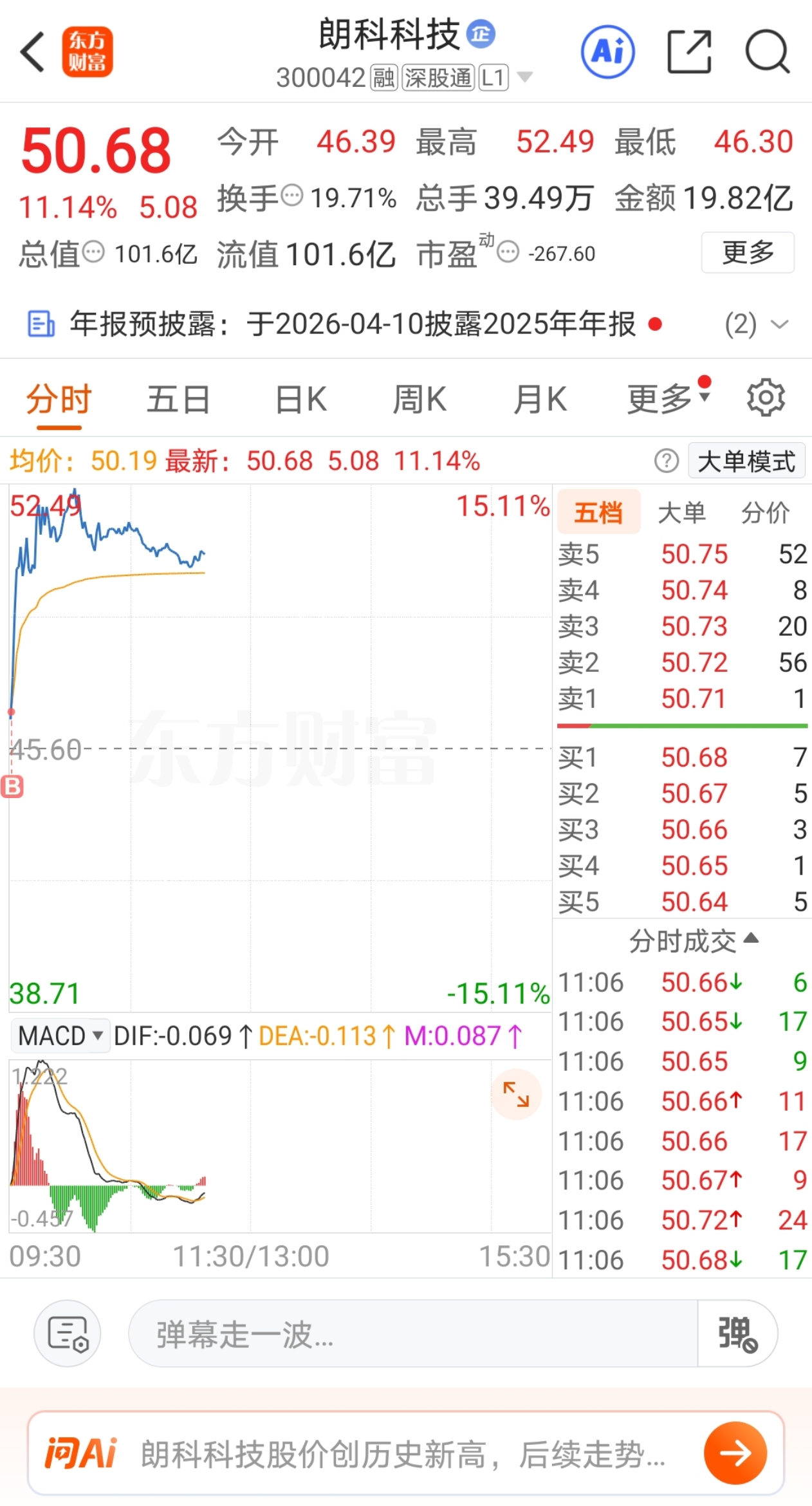 今天早盘介入了个股$朗科科技(SZ300042)$