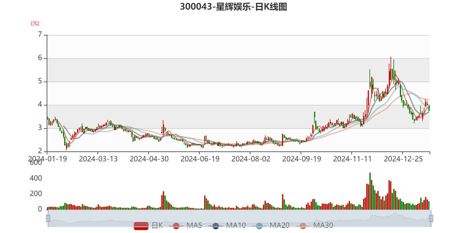 中证智能财讯星辉娱乐(300043)1月19日晚间披露2024年度业绩预告,预计2024年归母净利润亏损3.9亿元至5.6亿元,上年同期盈利2770.85万元;扣非净利润亏损4.03亿元至5.76亿元,上年同期亏损8781.54万元。以1月17日收盘价计算,星辉娱乐目前市盈率(TTM)约为-8.33倍至-11.96倍,市净率(LF)约2.75倍,市销率(TTM)约3.59倍。