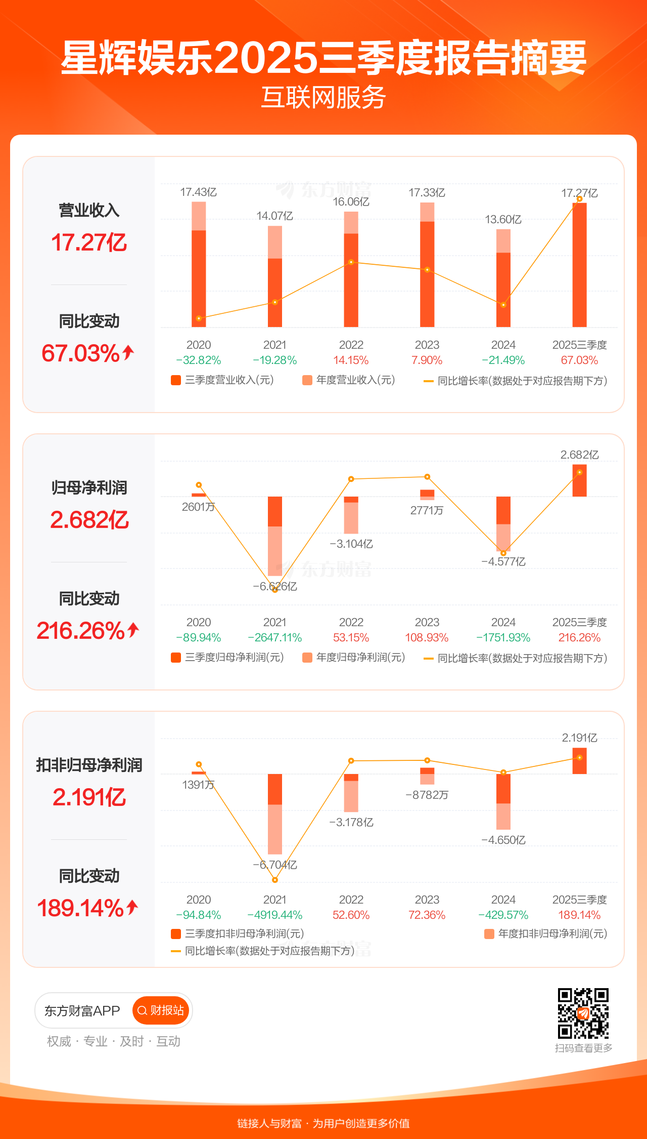 星辉娱乐10月30日发布2025年三季报显示,公司前三季实现营业收入17.27亿元,同比增长67.03%;归母净利润2.68亿元,同比增长216.26%;扣非归母净利润2.19亿元,同比增长189.14%。