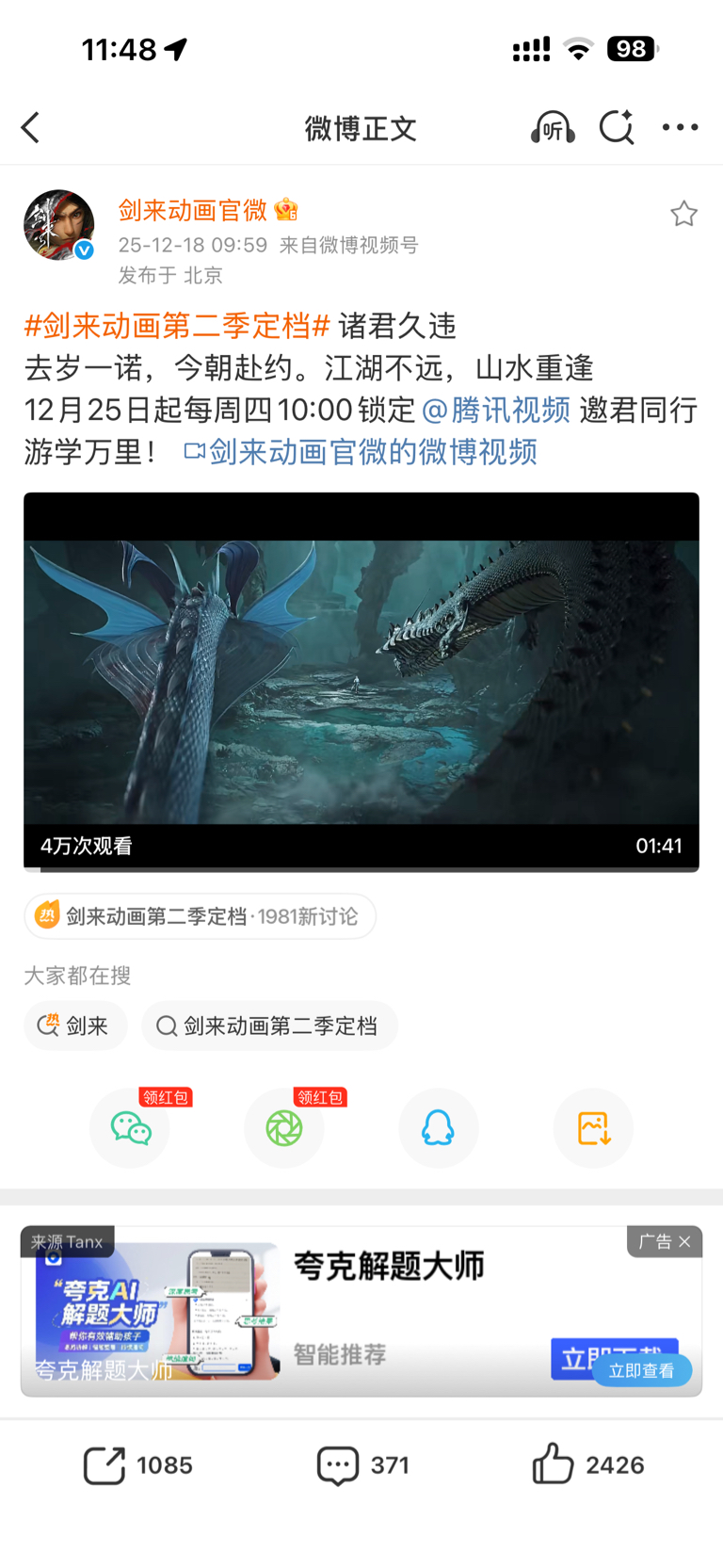 $星辉娱乐(SZ300043)$ 剑来 2 12 月 25 定档
