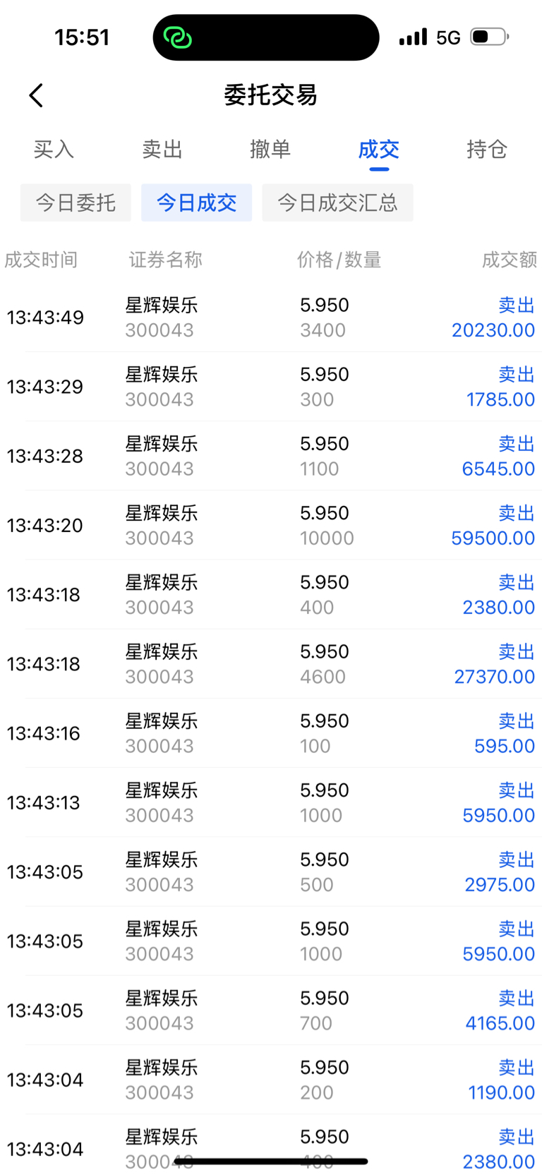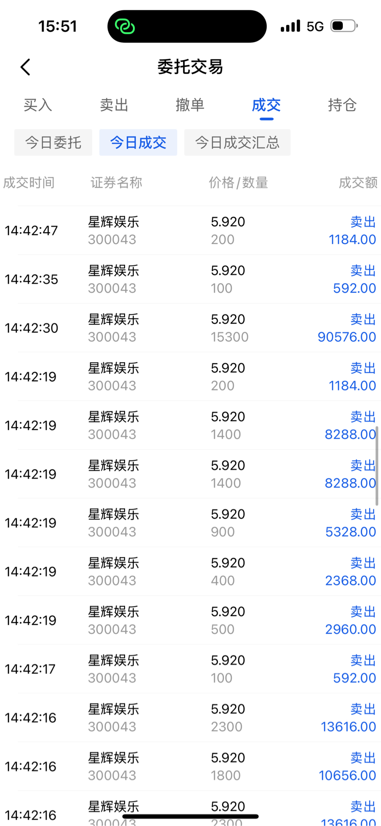 $星辉娱乐(SZ300043)$ 今天大盘这么好,星辉居然是绿的,只能先减仓1/3,明天再绿再减,直至清完,主力今天这样砸盘不厚道!我又不贪心,给我10个点的利润,我就走了,上周五不应该补仓的,有9个点的利润不走,被深股通吸引,加仓,搞得今天还剩不到4个点的利润!后悔死了
