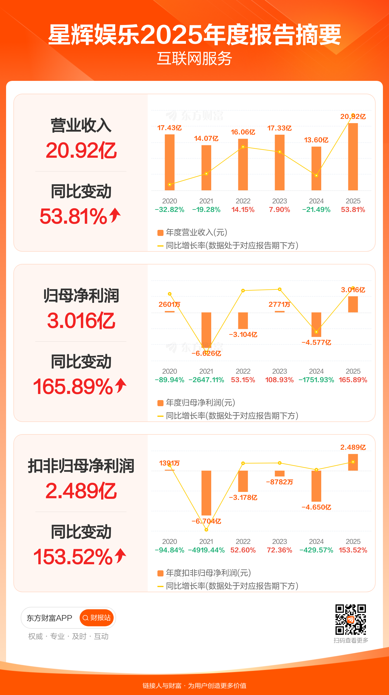 星辉娱乐3月31日发布2025年年报显示,公司全年实现营业收入20.92亿元,同比增长53.81%;归母净利润3.02亿元,同比增长165.89%;扣非归母净利润2.49亿元,同比增长153.52%。