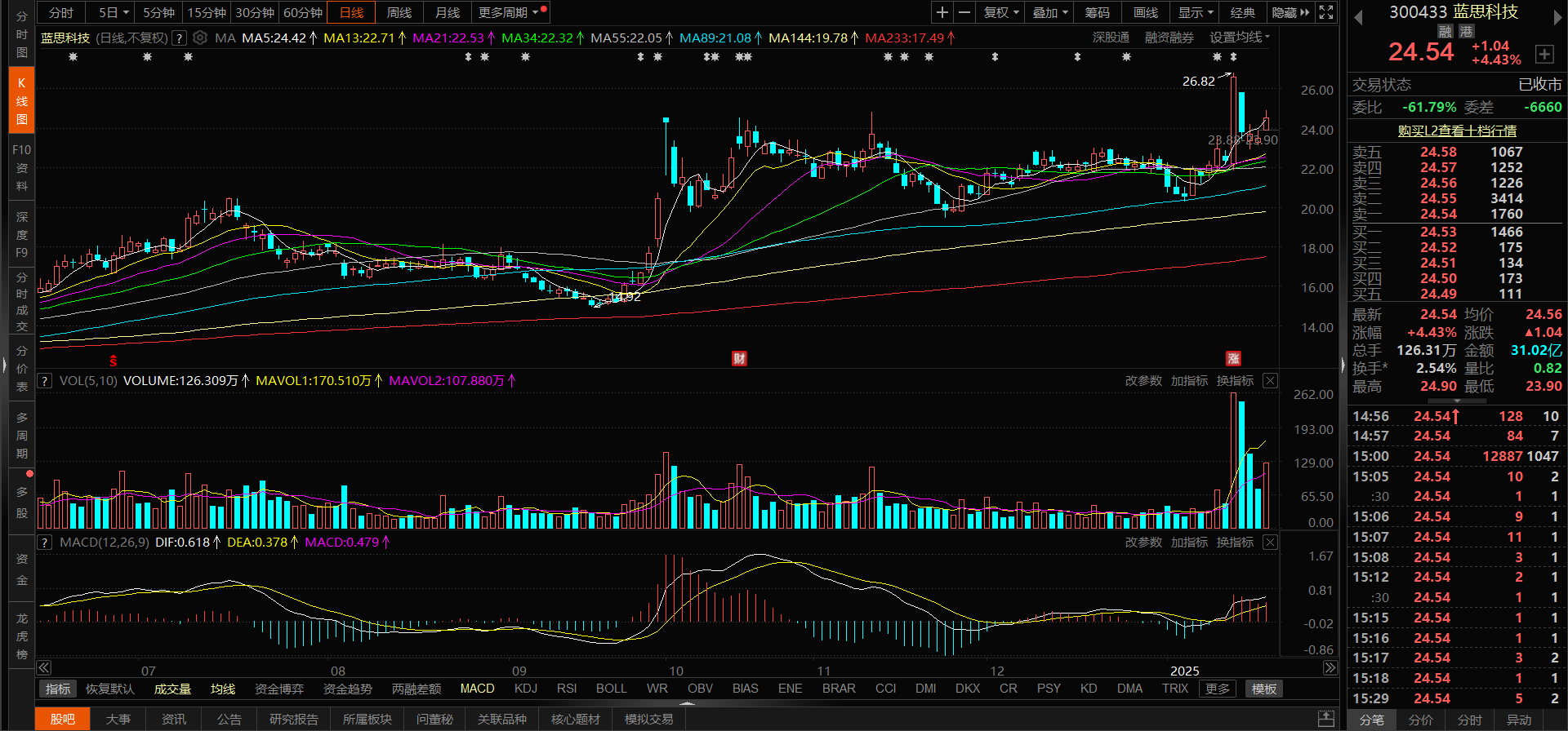 蓝思科技:该谷之前一直在跟踪,15日当天早上还说过。今天看着分时走势很强,所以评论区也说了,日线走势来看,14日大阳线之后,回调三天,今天开始向上走,可能是调整结束的信号,基本面来看,公司是消费电子板块,主要产品有智能手机电15日脑类、新能源汽车及智能座舱类、智能头显与智能穿戴类、其他智能终端类。消费电子的方向是中线看好的,而该谷是蓝筹,业绩非常不错,年报有预增的预期,因此走势既然走强了,少量的跟一下问题应该是不大的。$蓝思科技(SZ300433)$