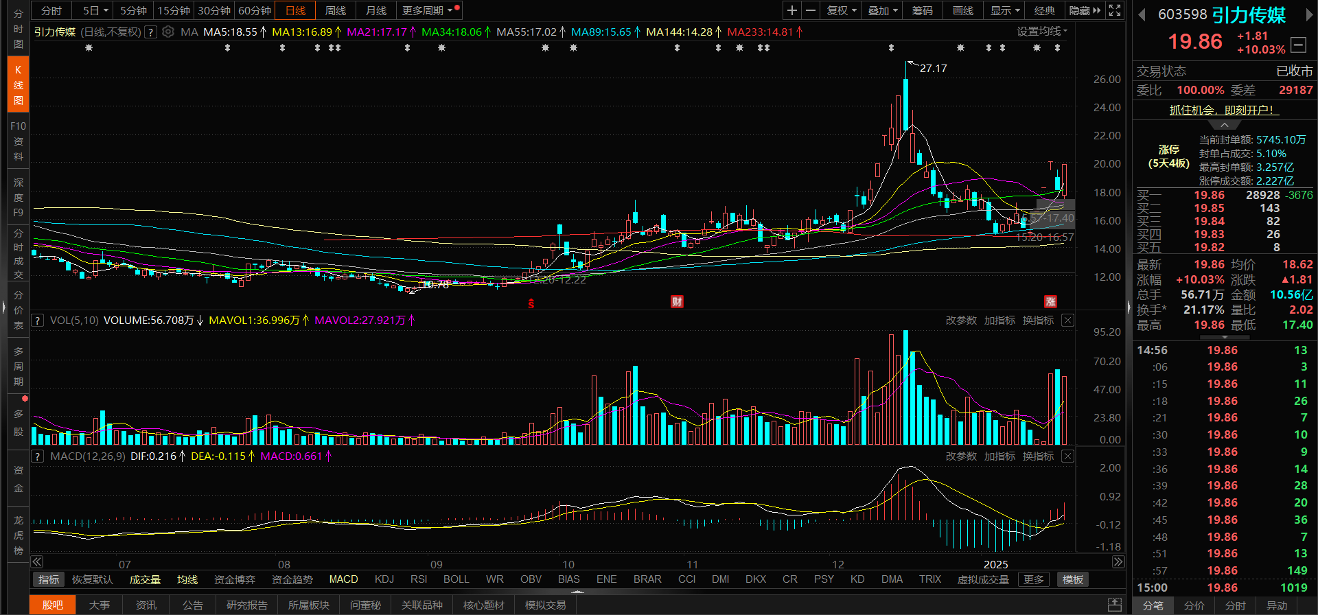 引力传媒:今天小幅低开之后震荡上行直接拉升整体, 反包了上周五的跌停板,最近三根K线走势就是个洗盘的形态。今天小红书是分化很明显,该谷还能继续走强,说明后市还是有空间。基本面来看,公司是小红书首期人才共建代理商、小红书2024IP营销先锋合作伙伴等,题材关联度高,明天看能否继续板了。$引力传媒(SH603598)$