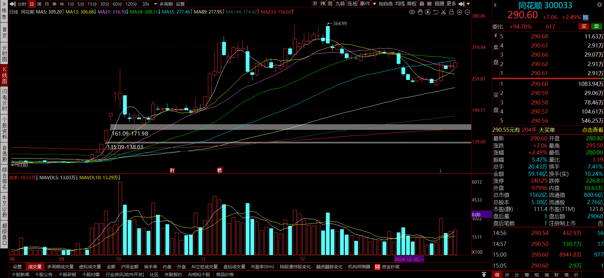 同花顺:今天冲高回落,走势弱于预期,早盘走的还是很强,午盘之所以走弱,主要是大盘下来了。基本面来看,公司以AI为抓手,助力打开市场空间,公司是互联网金融金融板块的头部公司,运用多模态大模型技术赋能公司现有的业务场景、产品和服务体系进一步加大研发。早在去年三季度公司对多模态大模型技术攻关和产品应用的研发,并且,公司的谷票类APP排国内前三,致力于“AI+金融”技术探索和场景应用,随着AI金融的发展,公司有望持续增加金融服务业务收益。今天虽然回调但是没有破位,继续看到364附近。