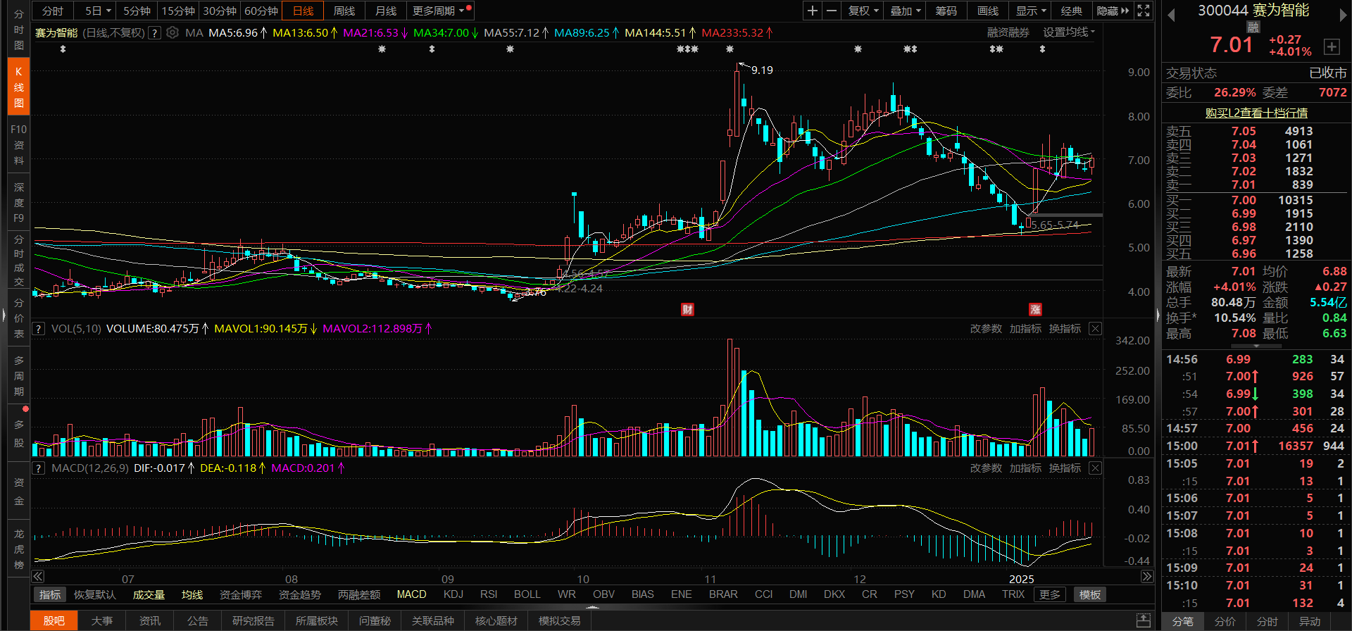 赛为智能:早盘看着鹏欣资源走弱,临时决定换成赛为智能,这只谷前面一直跟踪,今天分时承接很强,所以进来做先手。基本面来看,公司是国内城市轨道交通智能化和建筑智能化的知名品牌,主要业务有三大块,人工智能、智慧城市、文化教育三大主营业务板块。 题材方面,主要是人工智能+机器人+无人机的概念。目前,公司已研制开发出多款工业巡检机器人,并自主研发巡检运维平台,可以面向不同的工业应用场景,替代人工完成巡检任务,实现机器代人、无人值守。而且公司2014年就开始研究无人机产品,目前公司的赛鹰无人机系列产品种类丰富。今天拉出一根小阳线反包了昨日的阴线,现在应该是安全了。