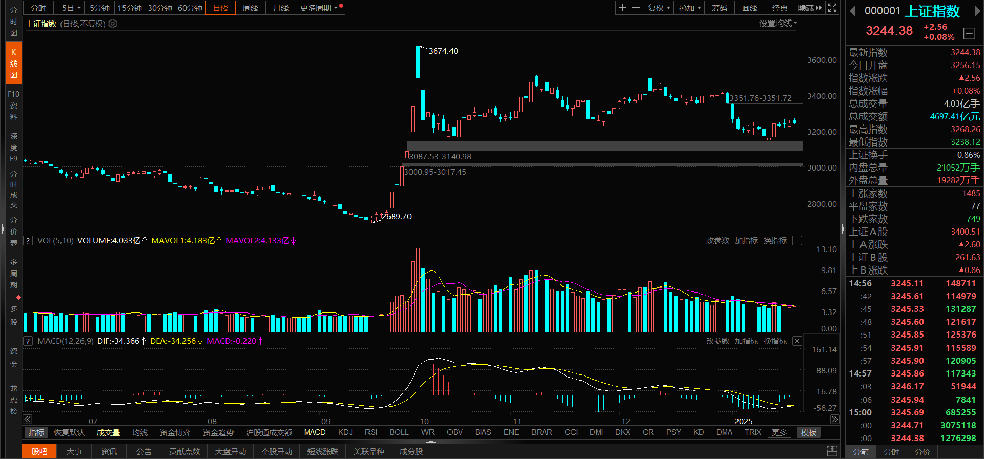 从技术形态来看,上证指数可能正在构建一个复杂的整理形态,如头肩底、矩形整理等,但是今天的走势并未明确打破这一形态,而是继续在形态内部进行震荡。这种震荡走势往往意味着市场多空双方力量相对均衡,暂时未能形成明确的方向性突破。